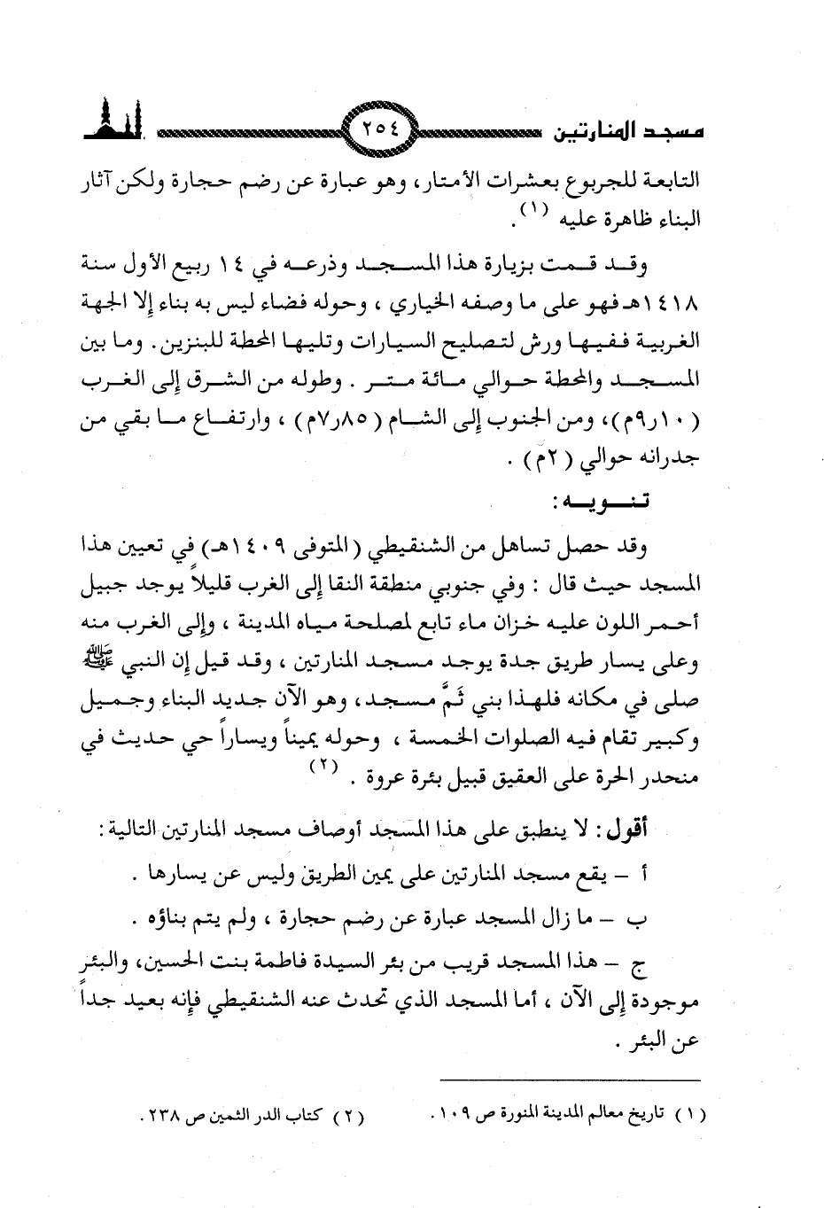 وقد حصل تساهل من الشنقطي (المتوفي 1409 هـ) في تعيين هذا المسجد حيث قال: وفي جنوبي منطقة النقا إلى الغرب قليلاً يوجد جبيل أحمر اللون عليه خزان ماء تابع لمصلحة مياه المدينة، وإلى الغرب منه وعلى يسار طريق جدة يوجد مسجد المنارتين، وقد قيل إن النبي صلى الله عليه وسلم صلى في مكانه فلهذا بني ثَمَّ مسجد، وهو الآن جديد البناء وجميل وكبير تقام فيه الصلوات الخمسة، وحوله يميناً ويساراً حي حديث في منحدر الحرة على العقيق قبيل بئرة عروة (2).