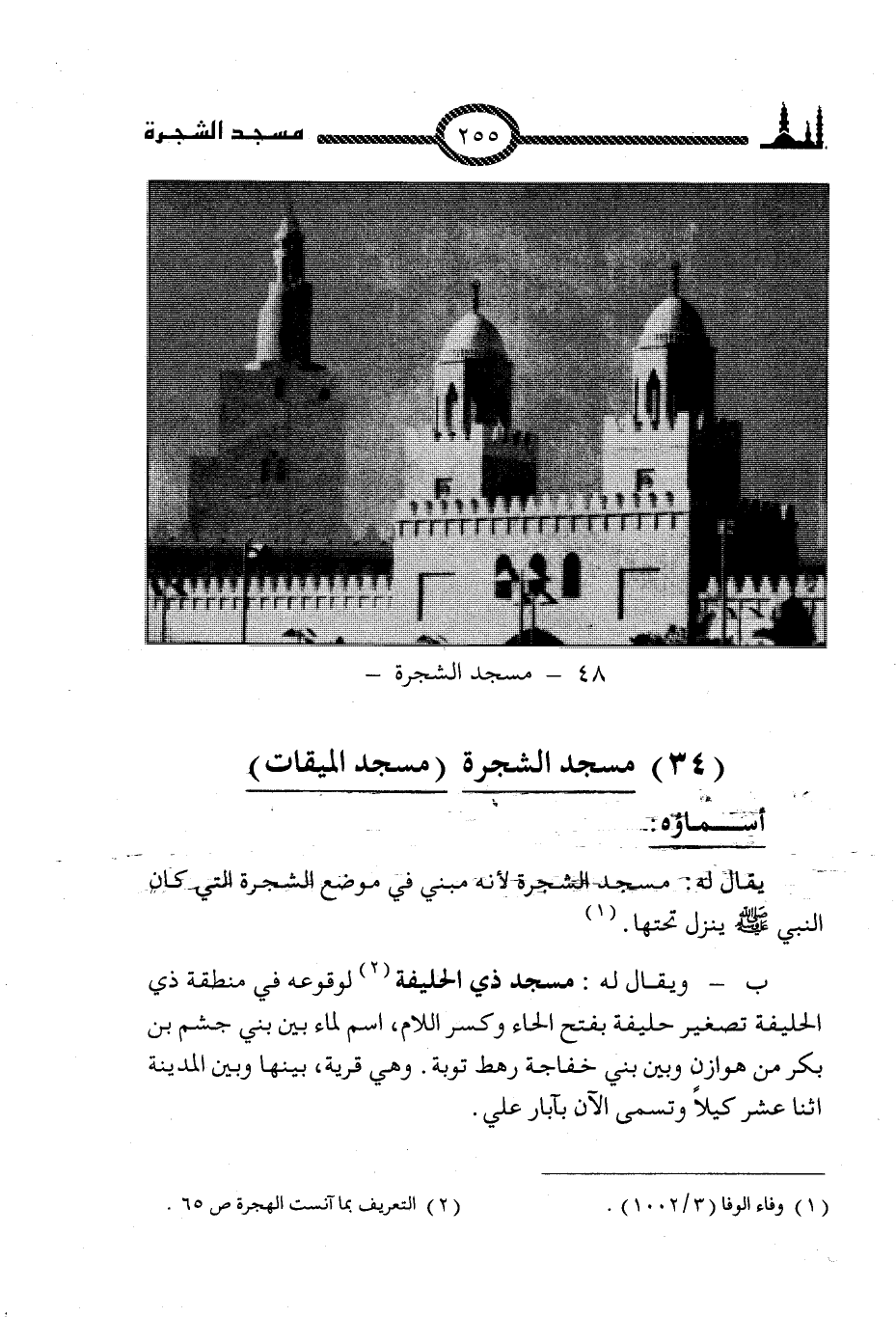 ب- ويقال له: مسجد ذي الحليفة (2) لوقوعه في منطقة ذي الحليفة تصغير حليفة بفتح الحاء وكسر اللام، اسم لماء بين بني جشم بن بكر من هوزان وبين بني خفاجة رهط توبة. وهي قرية، بينها وبين المدينة اثنا عشر كيلاً وتسمى الآن بآر علي.