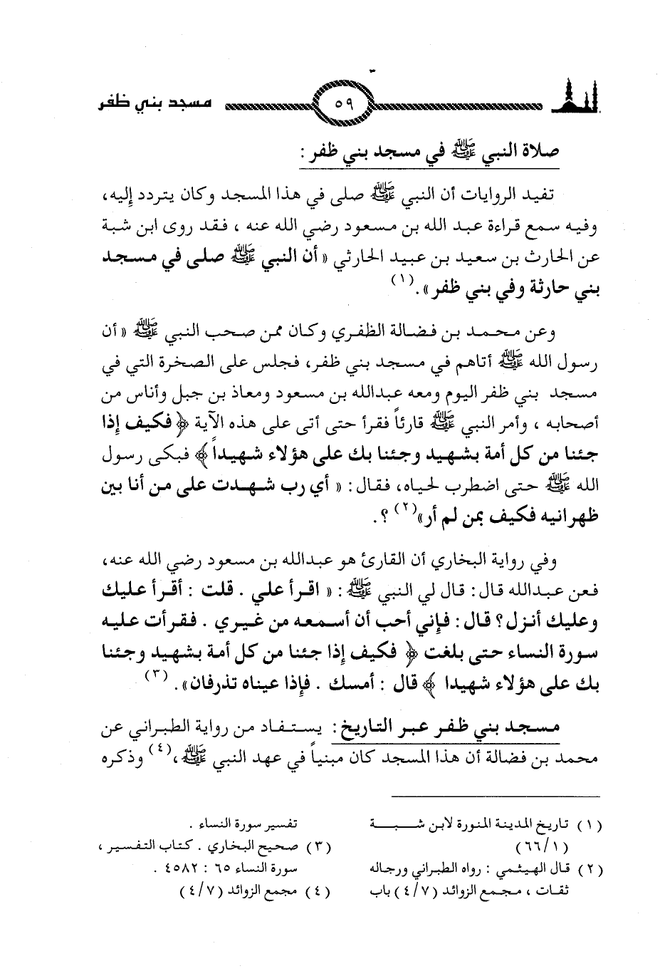 وعن محمد بن فضالة الظفري وكان ممن صحب النبي صلى الله عليه وسلم ((أن رسول الله صلى الله عليه وسلم أتاهم في مسجد بني ظفر، فجلس على الصخرة التي في مسجد بني ظفر اليوم ومعه عبدالله بن مسعود ومعاذ بن جبل وأناس من أصحابه، وأمر النبي صلى الله عليه وسلم قارئاً فقرأ حتى أتى على هذه الآية {فكيف إِذا جئنا من كل أمة بشهيد وجئنا بك على هؤلاء شهيداً} فبكى رسول الله صلى الله عليه وسلم حتى اضطرب لحياه، فقال: ((أي رب شهدت على من أنا بين ظهرانيه فكيف بمن لم أر)) (5)؟.