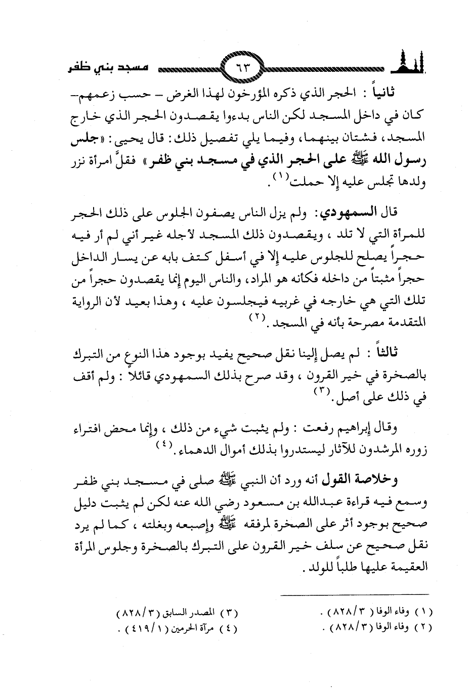 ثانياً: الحجر الذي ذكره المؤرخون لهذا الغرض - حسب زعمهم - كان في داخل المسجد لكن الناس بدءوا يقصدون الحجر الذي خارج المسجد، فشتان بينهما، وفيما يلي تفصيل ذلك: قال يحيى: ((جلس رسول الله صلى الله عليه وسلم على الحجر الذي في مسجد بني ظفر)) فقلَّ امرأة نزر ولدها تجلس عليه إِلا حملت (1).