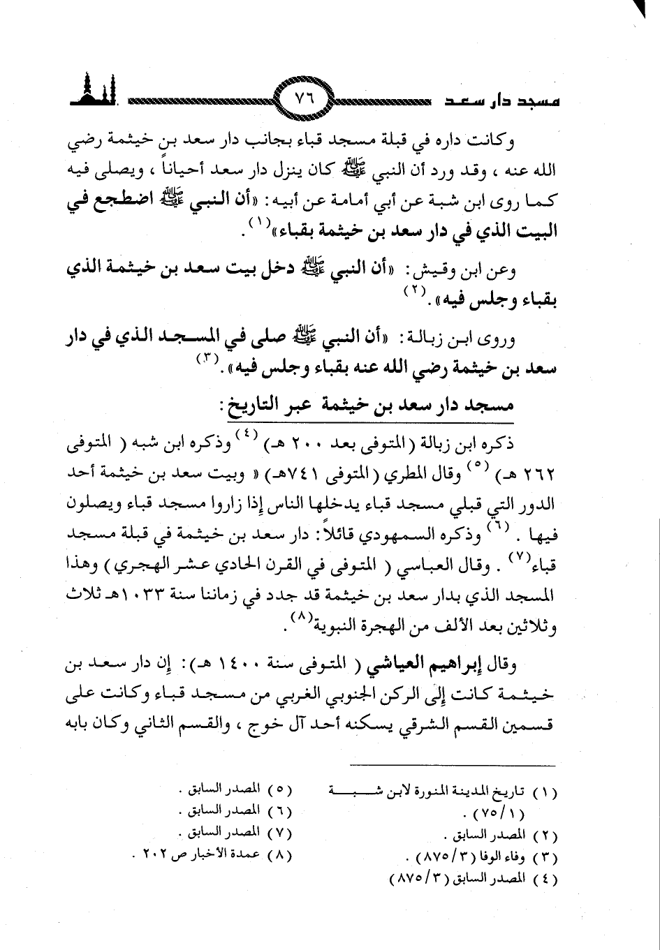 وروى ابن زبالة: ((أن النبي صلى الله عليه وسلم صلى في المسجد الذي في دار سعد بن خيثمة رضي الله عنه بقباء وجلس فيه)) (3).