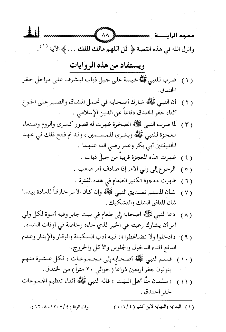 (10) قسم النبي صلى الله عليه وسلم أصحابه إلى مجموعات، فكل عشرة منهم يتولون حفر أربعين ذراعاً (حوالي 20 متراً) من الخندق.