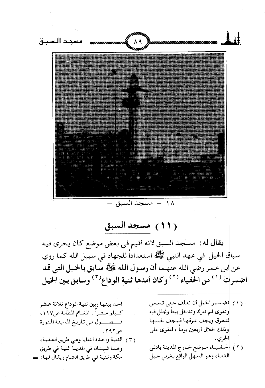 يقال له: مسجد السبق لأنه أقيم في بعض موضع كان يجرى فيه سابق الخيل في عهد النبي صلى الله عليه وسلم استعداداً للجهاد في سبيل الله كما روي عن ابن عمر رضي الله عنهما أن رسول الله صلى الله عليه وسلم سابق بالخيل التي قد اضمرت (1) من الحفياء (2) وكان أمدها ثنية الوداع (3) وسابق بين الخيل