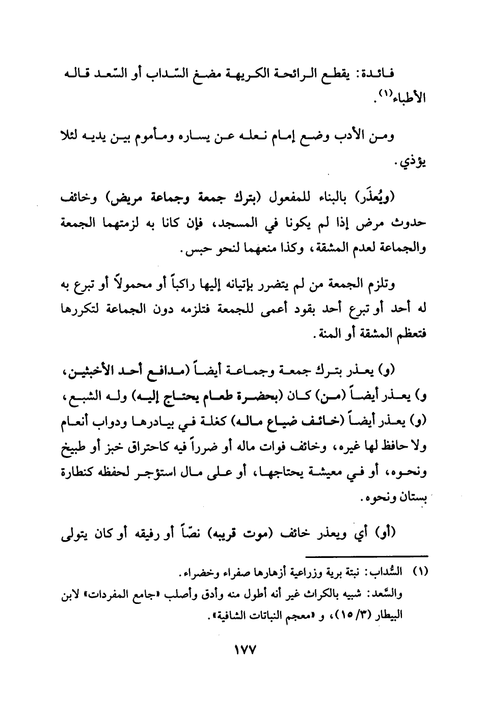 - فَائِدَة: يقطع الرَّائِحَة الكريهة مَعَ السداب أَو السعد قَالَه الْأَطِبَّاء. وَمن الْأَدَب وضع إِمَام نَعله عَن يسَاره ومأموم بَين يَدَيْهِ لِئَلَّا يُؤْذِي. ويعذر بِالْبِنَاءِ للْمَفْعُول بترك جُمُعَة وَجَمَاعَة مَرِيض وخائف حُدُوث مرض إِذا لم يَكُونَا فِي الْمَسْجِد، فَإِن كَانَ بِهِ لَزِمته الْجُمُعَة وَالْجَمَاعَة لعدم الْمَشَقَّة، وَكَذَا من منعهما لنَحْو حبس، وَتلْزم الْجُمُعَة من لم يتَضَرَّر بإتيانه إِلَيْهَا رَاكِبًا أَو مَحْمُولا أَو تبرع بِهِ لَهُ أحد بقود أعمى للْجُمُعَة فَتلْزمهُ دون الْجَمَاعَة لتكررها فتعظم الْمَشَقَّة ويعذر بترك جُمُعَة وَجَمَاعَة أَيْضا مدافع أحد الأخبثين، ويعذر أَيْضا من كَانَ بِحَضْرَة طَعَام يحْتَاج إِلَيْهِ وَله الشِّبَع ويعذر أَيْضا خَائِف ضيَاع مَاله كغلة فِي بيادرها ودواب أنعام وَلَا حَافظ لَهَا غَيره، وخائف فَوَات مَاله أَو ضَرَرا فِيهِ كاحتراق خبز أَو طبيخ وَنَحْوه، أَو فِي معيشة يحتاجها، أَو على مَال اُسْتُؤْجِرَ لحفظه كنظارة بُسْتَان وَنَحْوه أَو أَي ويعذر خَائِف موت قَرِيبه نصا أَو رَفِيقه أَو كَانَ يتَوَلَّى