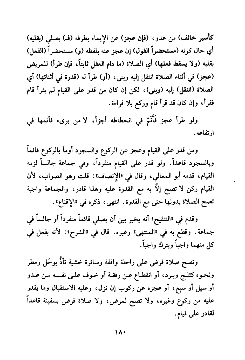 كأسير خَائِف من عَدو فَإِن عجز عَن الْإِيمَاء بطرفه ف يُصَلِّي بِقَلْبِه أَي حَال كَونه مستحضرا القَوْل إِن عجز عَنهُ بِلَفْظِهِ ومستحضرا الْفِعْل بِقَلْبِه وَلَا يسْقط فعلهَا أَي الصَّلَاة مَا دَامَ الْعقل ثَابتا، فَإِن طَرَأَ للْمَرِيض عجز فِي أثْنَاء الصَّلَاة انْتقل إِلَيْهِ وَبنى أَو طَرَأَ لَهُ قدرَة فِي أَثْنَائِهَا أَي الصَّلَاة انْتقل إِلَيْهِ وَبنى لَكِن إِذا كَانَ من قدر على الْقيام لم يقْرَأ قَامَ فَقَرَأَ، وَإِن كَانَ قد قَرَأَ قَامَ وَركع بِلَا قِرَاءَة، وَلَو طَرَأَ عجز قَائِم فِي انحطاط أجزأء لَا من برىء فأتمها فِي ارتفاعه، وَمن قدر على الْقيام وَعجز عَن الرُّكُوع وَالسُّجُود أَوْمَأ بِالرُّكُوعِ قَائِما وبالسجود قَاعِدا، وَلَو قدر على الْقيام مُنْفَردا، وَفِي جمَاعَة جَالِسا لزمَه الْقيام، قدمه أَبُو الْمَعَالِي، وَقَالَ فِي الْإِنْصَاف: قلت وَهُوَ الصَّوَاب، لِأَن الْقيام ركن لَا تصح إِلَّا بِهِ مَعَ الْقُدْرَة عَلَيْهِ وَهَذَا قَادر، وَالْجَمَاعَة وَاجِبَة تصح الصَّلَاة بِدُونِهَا حَتَّى مَعَ الْقُدْرَة، انْتهى. ذكره فِي الْإِقْنَاع. وَقدم فِي التَّنْقِيح أَنه يُخَيّر بَين أَن يُصَلِّي قَائِما مُنْفَردا أَو جَالِسا فِي جمَاعَة: وَقطع بِهِ فِي الْمُنْتَهى وَغَيره، قَالَ فِي الشَّرْح: لِأَنَّهُ يفعل فِي كل مِنْهُمَا وَاجِبا وَيتْرك وَاجِبا، وَتَصِح صَلَاة فرض على رَاحَة واقفة وسائرة خشيَة تأذ بوحل ومطر وَنَحْوه كثلج وَبرد وَانْقِطَاع عَن رفْقَة أَو خوفًا على نَفسه من عَدو أَو سيل أَو سبع أَو عجز عَن ركُوب إِن نزل، وَعَلِيهِ الِاسْتِقْبَال وَمَا يقدر عَلَيْهِ من رُكُوع وَغَيره، وَلَا تصح لمَرض، وَلَا صَلَاة فرض بسفينة قَاعِدا لقادر على قيام،