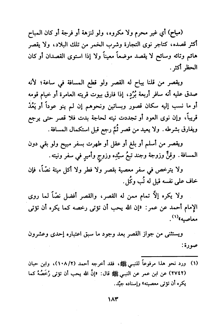 مُبَاح أَي غير محرم وَلَا مَكْرُوه، وَلَو لنزهة أَو فُرْجَة أَو كَانَ الْمُبَاح أَكثر قَصده كتاجر نوى التِّجَارَة وَشرب الْخمر من تِلْكَ اللبلاد، وَلَا يقصر هائم وتائه وسائح لَا يقْصد موضعا معينا وَلَا إِذا اسْتَوَى القصدان أَو كَانَ الْحَظْر أَكثر. وَيقصر من قُلْنَا يُبَاح لَهُ الْقصر وَلَو قطع الْمسَافَة فِي سَاعَة، لِأَنَّهُ صدق عَلَيْهِ أَنه سَافر أَرْبَعَة برا إِذا فَارق بيُوت قريته العامرة أَو خيام قومه أَو مَا نسب إِلَيْهِ سكان قُصُور وبساتين وَنَحْوهم، إِن لم ينْو عودا أَو يعد قَرِيبا، وَإِن نوى الْعود أَو تَجَدَّدَتْ نِيَّته لحَاجَة بَدَت فَلَا قصر حَتَّى يرجع وَيُفَارق بِشَرْطِهِ. لَا يُعِيد من قصر ثمَّ قبل استكمال الْمسَافَة. وَيقصر من أسلم أَو بلغ عقل أَو طهرت بسفر مُبِيح وَلَو بَقِي دون الْمسَافَة. وقن وَزَوْجَة وجند تبع سَيّده وَزوج وأمير فِي سفر وَنِيَّته. وَلَا يترخص فِي سفر مَعْصِيّة بقصر وَلَا فطر وَلَا أكل ميتَة نصا. فَإِن خَافَ على نَفسه قيل لَهُ تب وكل. وَلَا يكره الْإِتْمَام مِمَّن لَهُ الْقصر، وَالْقصر أفضل نصا لما روى الإِمَام أَحْمد عَن عمر: (إِن الله يحب أَن تُؤْتى رخصه كَمَا يكره أَن تُؤْتى مَعَاصيه) . وَيسْتَثْنى من جَوَاز الْقصر بعد وجود مَا سبق اعْتِبَاره إِحْدَى وَعِشْرُونَ صُورَة: