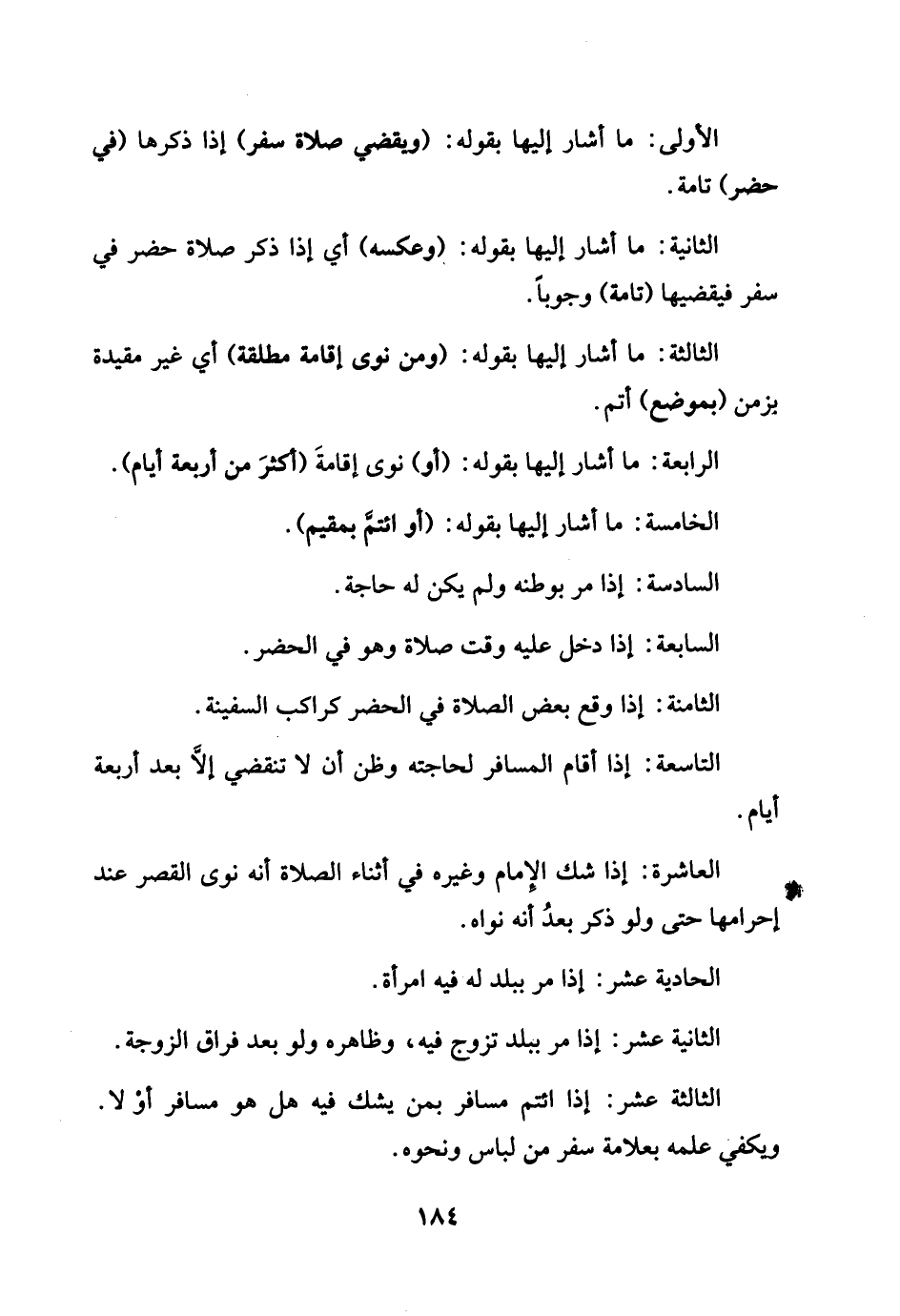 الأولى مَا أَشَارَ إِلَيْهَا بقوله وَيَقْضِي صَلَاة سفر إِذا ذكرهَا فِي حضر تَامَّة. الثَّانِيَة مَا أَشَارَ إِلَيْهَا بقوله وَعَكسه أَي إِذا ذكر صَلَاة حضر فِي سفر فيقضيها تَامَّة وجوبا. الثَّالِثَة مَا أَشَارَ إِلَيْهَا بقوله وَمن نوى إِقَامَة مُطلقَة أَي غير مُقَيّدَة بِزَمن بِموضع أتم. الرَّابِعَة مَا أَشَارَ إِلَيْهِ بقوله أَو نوى إِقَامَة أَكثر من أَرْبَعَة أَيَّام. الْخَامِسَة مَا أَشَارَ إِلَيْهَا بقوله أَو ائتم بمقيم. السَّادِسَة إِذا مر بوطنه وَلَو لم يكن لَهُ بِهِ حَاجَة. السَّابِعَة إِذا دخل عَلَيْهِ وَقت صَلَاة وَهُوَ فِي الْحَضَر. الثَّامِنَة إِذا وَقع بعض الصَّلَاة فِي الْحَضَر كراكب السَّفِينَة. التَّاسِعَة إِذا أَقَامَ الْمُسَافِر لِحَاجَتِهِ وَظن أَن لَا تَنْقَضِي إِلَّا بعد أَرْبَعَة أَيَّام. الْعَاشِرَة إِذا شكّ الإِمَام وَغَيره فِي أثْنَاء الصَّلَاة أَنه نوى الْقصر عِنْد إحرامها حَتَّى وَلَو ذكر أَنه نَوَاه. الْحَادِيَة عشرَة إِذا مر بِبَلَد لَهُ فِيهِ امْرَأَة. الثَّانِيَة عشرَة إِذا مر بِبَلَد تزوج فِيهِ، وَظَاهره وَلَو بعد فِرَاق الزَّوْجَة. الثَّالِثَة عشرَة إِذا ائتم مُسَافر بِمن يشك فِيهِ هَل هُوَ مُسَافر أَو لَا. يَكْفِي علمه بعلامة سفر من لِبَاس وَنَحْوه.