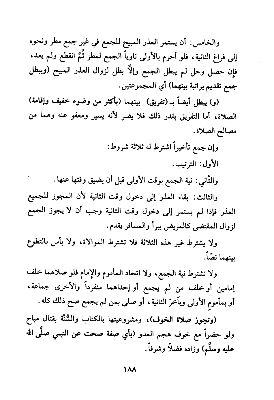 وَالْخَامِس أَن يسْتَمر الْعذر الْمُبِيح للْجمع فِي غير جمع مطر وَنَحْوه إِلَى فرَاغ الثَّانِيَة، فَلَو أحرم بِالْأولَى نَاوِيا الْجمع لمطر ثمَّ انْقَطع وَلم يعد فَإِن حصل وَحل لم يبطل الْجمع وَإِلَّا بَطل لزوَال الْعذر الْمُبِيح وَيبْطل جمع تَقْدِيم براتبة بَينهمَا أَي المجموعتين وَيبْطل أَيْضا ب تَفْرِيق بَينهمَا بِأَكْثَرَ من وضوء خَفِيف وَإِقَامَة الصَّلَاة، أما التَّفْرِيق بِقدر ذَلِك فَلَا يضر لِأَنَّهُ يسير ومعفو عَنهُ، وهما من مصَالح الصَّلَاة. وَإِن جمع تَأْخِيرا اشْترط لَهُ ثَلَاثَة شُرُوط: الأول التَّرْتِيب. وَالثَّانِي نِيَّة الْجمع بِوَقْت الأولى قبل أَن يضيق وَقتهَا عَنْهَا. وَالثَّالِث بَقَاء الْعذر إِلَى دُخُول وَقت الثَّانِيَة، لِأَن المجوز للْجمع الْعذر، فَإِذا لم يسْتَمر إِلَى دُخُول وَقت الثَّانِيَة وَجب أَن يجوز الْجمع لزوَال الْمُقْتَضِي كَالْمَرِيضِ يبرأ وَالْمُسَافر يقدم. وَلَا يشْتَرط غير هَذِه الثَّلَاثَة فَلَا تشْتَرط الْمُوَالَاة وَلَا بَأْس بالتطوع بَينهمَا. نصا. وَلَا تشْتَرط نِيَّة الْجمع، وَلَا اتِّحَاد الْمَأْمُوم وَالْإِمَام فَلَو صلاهَا خلف إمامين أَو خلف من لم يجمع أَو إِحْدَاهمَا مُنْفَردا وَالْأُخْرَى جمَاعَة أَو بمأموم الأولى وبآخر الثَّانِيَة أَو صلى بِمن لم يجمع صَحَّ ذَلِك كُله.