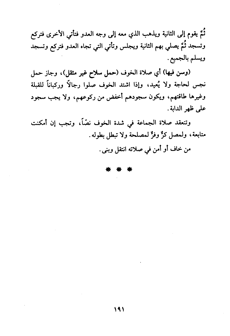 - وَسن فِيهَا أَي صَلَاة الْخَوْف حمل سلَاح غير مثقل وَجَاز حمل نجس لحَاجَة وَيُعِيد، وَإِذا اشْتَدَّ الْخَوْف صلوا رجَالًا وركبانا للْقبْلَة وَغَيرهَا يومئون طاقتهم، وَيكون سجودهم أَخفض من ركوعهم، وَلَا يجب سُجُود على ظهر الدَّابَّة. وتنعقد صَلَاة الْجَمَاعَة فِي شدَّة الْخَوْف نصا، وَتجب إِن أمكنت مُتَابعَة ولمصل كرّ وفر لمصْلحَة وَلَا تبطل بِطُولِهِ. وَمن خَافَ أَو أَمن فِي صلَاته انْتقل وَبنى.