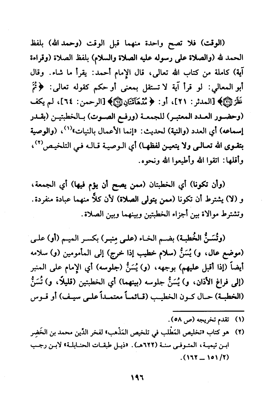 الْوَقْت فَلَا تصح وَاحِدَة مِنْهُمَا قبل الْوَقْت وَحمد الله بِلَفْظ الْحَمد لله وَالصَّلَاة على النَّبِي رَسُوله عَلَيْهِ الصَّلَاة وَالسَّلَام بِلَفْظ الصَّلَاة وَقِرَاءَة آيَة كَامِلَة من كتاب الله تَعَالَى، قَالَ الإِمَام ١٦ (أَحْمد) : يقْرَأ مَا شَاءَ. وَقَالَ أَبُو الْمَعَالِي: لَو قَرَأَ آيَة لَا تستقل بِمَعْنى أَو حكم كَقَوْلِه تَعَالَى (ثمَّ نظر) أَو (مدهامتان) لم تكف وَحُضُور الْعدَد الْمُعْتَبر للْجُمُعَة وَرفع الصَّوْت بالخطبتين بِقدر إسماعه أَي الْعدَد وَالنِّيَّة لحَدِيث (إِنَّمَا الْأَعْمَال بِالنِّيَّاتِ) وَالْوَصِيَّة بتقوى الله تَعَالَى وَلَا يتَعَيَّن لَفظهَا أَي الْوَصِيَّة قَالَ فِي التَّلْخِيص وأقلها: اتَّقوا الله وَأَطيعُوا الله وَنَحْوه وَأَن تَكُونَا أَي الخطبتان مِمَّن يَصح أَن يؤم فِيهَا أَي الْجُمُعَة وَلَا يشْتَرط أَن تَكُونَا مِمَّن يتَوَلَّى الصَّلَاة لِأَن كلا مِنْهُمَا عبَادَة مُنْفَرِدَة. وتشترط مولاة بَين أَجزَاء الْخطْبَتَيْنِ وَبَينهمَا وَبَين الصَّلَاة وَتسن الْخطْبَة بِضَم الْخَاء على مِنْبَر بِكَسْر الْمِيم أَو على مَوضِع عَال، وَيسن سَلام خطيب إِذا خرج إِلَى الْمَأْمُومين وَسَلَامه أَيْضا إِذا أقبل عَلَيْهِم بِوَجْهِهِ وَيسن جُلُوسه أَي الإِمَام على الْمِنْبَر إِلَى فرَاغ الْأَذَان وَيسن جُلُوسه بَينهمَا أَي الْخطْبَتَيْنِ قَلِيلا، وَتسن الْخطْبَة حَال كَون الْخَطِيب قَائِما مُعْتَمدًا على سيف أَو قَوس
