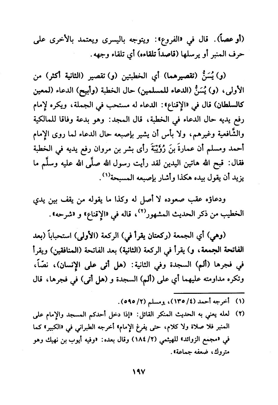 أَو عَصا. قَالَ فِي الْفُرُوع: وَيتَوَجَّهُ باليسرى ويعتمد بِالْأُخْرَى على حرف الْمِنْبَر أَو يرسلها قَاصِدا تلقاءه أَي تِلْقَاء وَجهه وَيسن تقصيرهما أَي الْخطْبَتَيْنِ وتقصير الثَّانِيَة أَكثر من الأولى وَيسن الدُّعَاء للْمُسلمين حَال الْخطْبَة وأبيح الدُّعَاء لمُعين كسلطان قَالَ فِي الْإِقْنَاع: الدُّعَاء لَهُ مُسْتَحبّ فِي الْجُمْلَة، وَيكرهُ لإِمَام رفع يَدَيْهِ حَال الدُّعَاء فِي الْخطْبَة، قَالَ الْمجد: وَهُوَ بِدعَة وفَاقا للمالكية وَالشَّافِعِيَّة وَغَيرهم، وَلَا بَأْس أَن يُشِير بإصبعه حَال الدُّعَاء، لما روى الإِمَام أَحْمد وَمُسلم أَن عمَارَة بن رويبة رأى بشر بن مَرْوَان رفع يَدَيْهِ فِي الْخطْبَة فَقَالَ: قبح الله هَاتين الْيَدَيْنِ لقد رَأَيْت رَسُول الله مَا يزِيد أَن يَقُول بِيَدِهِ هَكَذَا وَأَشَارَ بإصبعه المسبحة. ودعاؤه عقب صُعُوده لَا أصل لَهُ، وَكَذَا مَا يَقُوله من يقف بَين يَدي الْخَطِيب من ذكر الحَدِيث الْمَشْهُور قَالَه فِي الْإِقْنَاع وَشَرحه. وَهِي أَي الْجُمُعَة رَكْعَتَانِ يقْرَأ فِي الرَّكْعَة الأولى اسْتِحْبَابا بعد الْفَاتِحَة الْجُمُعَة وَيقْرَأ فِي الرَّكْعَة الثَّانِيَة بعد الْفَاتِحَة الْمُنَافِقين وَيقْرَأ فِي فجرها ألم السَّجْدَة وَفِي الثَّانِيَة هَل أَتَى على الْإِنْسَان نصا، وَتكره مداومته عَلَيْهِمَا أَي على ألم السَّجْدَة وَهل أَتَى فِي فجرها، قَالَ