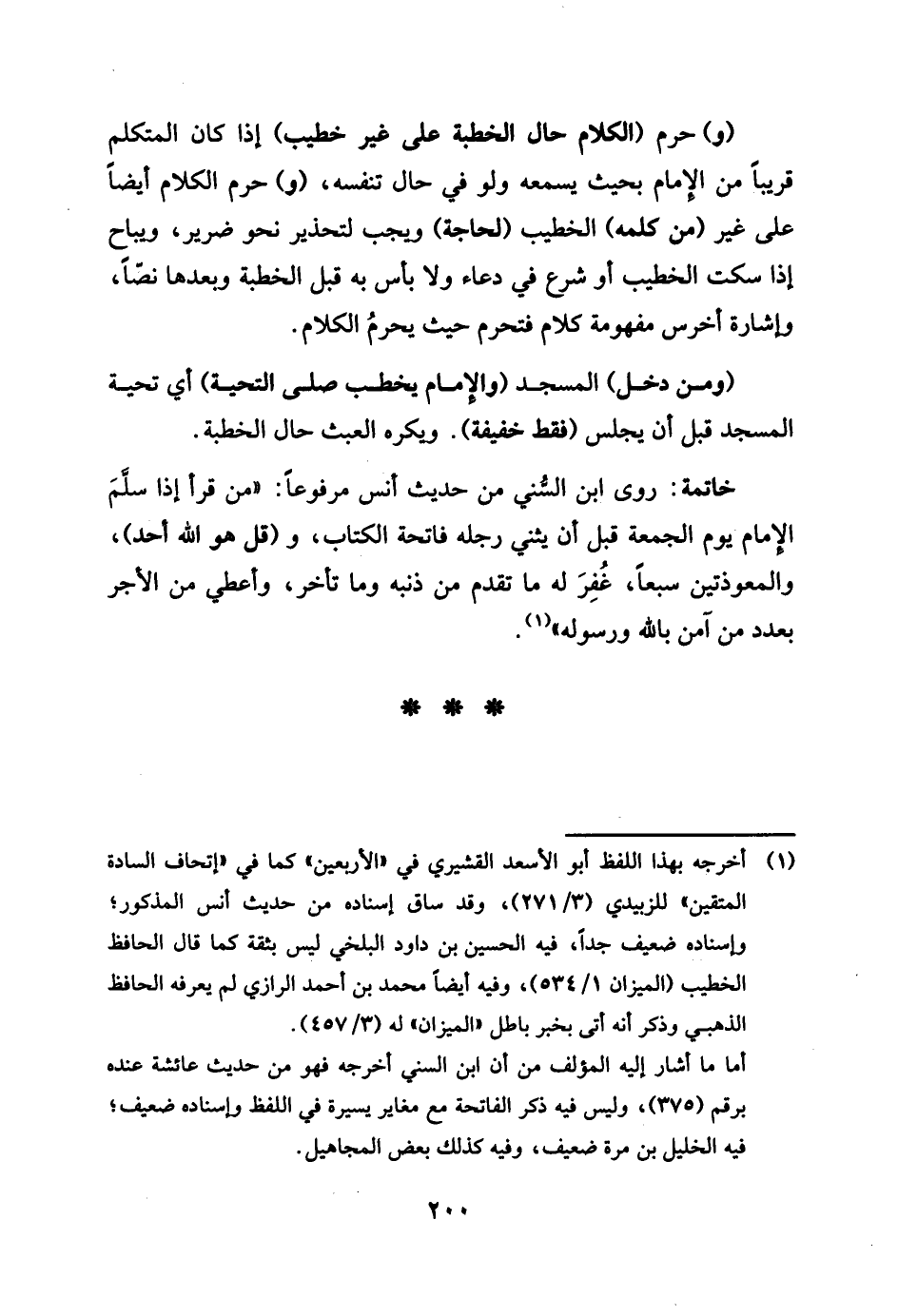 وَحرم الْكَلَام حَال الْخطْبَة على غير الْخَطِيب إِذا كَانَ الْمُتَكَلّم قَرِيبا من الإِمَام بِحَيْثُ يسمعهُ وَلَو فِي حَال تنفسه وَحرم الْكَلَام أَيْضا على غير من كَلمه الْخَطِيب لحَاجَة وَيجب لتحذير نَحْو ضَرِير، وَيُبَاح إِذا سكت الْخَطِيب أَو شرع فِي دُعَاء وَلَا بَأْس بِهِ قبل الْخطْبَة وَبعدهَا نصا، وَإِشَارَة أخرس مفهومة كَلَام تحرم حَيْثُ يحرم الْكَلَام، وَمن دخل الْمَسْجِد وَالْإِمَام يخْطب صلى التَّحِيَّة أَي تَحِيَّة الْمَسْجِد قبل أَن يجلس فَقَط خَفِيفَة. وَيكرهُ الْعَبَث حَال الْخطْبَة.
