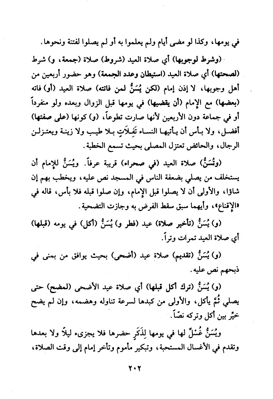 فِي يَوْمهَا، وَكَذَا لَو مضى أَيَّام وَلَو يعلمُوا بِهِ أَو لم يصلوا لفتنة وَنَحْوهَا وَشرط لوُجُوبهَا أَي صَلَاة الْعِيد شُرُوط صَلَاة جُمُعَة، وَشرط لصحتها أَي صَلَاة الْعِيد استيطان وَعدد الْجُمُعَة وَهُوَ حُضُور أَرْبَعِينَ من أهل وُجُوبهَا لَا إِذن إِمَام لَكِن يسن لمن فَاتَتْهُ صَلَاة الْعِيد أَو فَاتَهُ بَعْضهَا مَعَ الإِمَام أَن يَقْضِيهَا فِي يَوْمهَا قبل الزَّوَال وَبعده وَلَو مُنْفَردا أَو فِي جمَاعَة دون الْأَرْبَعين لِأَنَّهَا صَارَت تَطَوّعا وَكَونهَا على صفتهَا أفضل، وَلَا بَأْس أَن يَأْتِيهَا النِّسَاء تفلات بِلَا طيب وَلَا زِينَة يعتزلن الرِّجَال، وَالْحَائِض تَعْتَزِل الْمُصَلِّي بِحَيْثُ تسمع، وَتسن صَلَاة الْعِيد فِي صحراء قريبَة عرفا. وَيسن للْإِمَام أَن يسْتَخْلف من يُصَلِّي بضعفة النَّاس فِي الْمَسْجِد نَص عَلَيْهِ، ويخطب بهم إِن شَاءَ، وَالْأولَى أَن لَا يصلوا قبل الإِمَام، وَإِن صلوا قبله فَلَا بَأْس قَالَه فِي الْإِقْنَاع وَأيهمَا سبق سقط الْفَرْض بِهِ وَجَازَت التَّضْحِيَة. وَيسن تَأْخِير صَلَاة عيد فطر وَيسن أكل فِي يَوْمه قبلهَا أَي صَلَاة الْعِيد تمرات وترا وَيسن تَقْدِيم صَلَاة عيد أضحى بِحَيْثُ يُوَافق من بمنى فِي ذبحهم نَص عَلَيْهِ. وَيسن ترك أكل قبلهَا أَي صَلَاة الْأَضْحَى لمضح حَتَّى يُصَلِّي ثمَّ يَأْكُل، وَالْأولَى من كَبِدهَا لسرعة تنَاوله وهضمه، وَإِن لم يضح خير بَين أكل وَتَركه. نصا. وَيسن غسل لَهَا فِي يَوْمهَا لذكر حضرها فَلَا يجزىء لَيْلًا وَلَا بعْدهَا وَتقدم فِي الأغسال المستحبة، وتبكير مَأْمُوم وَتَأَخر إِمَام إِلَى وَقت الصَّلَاة