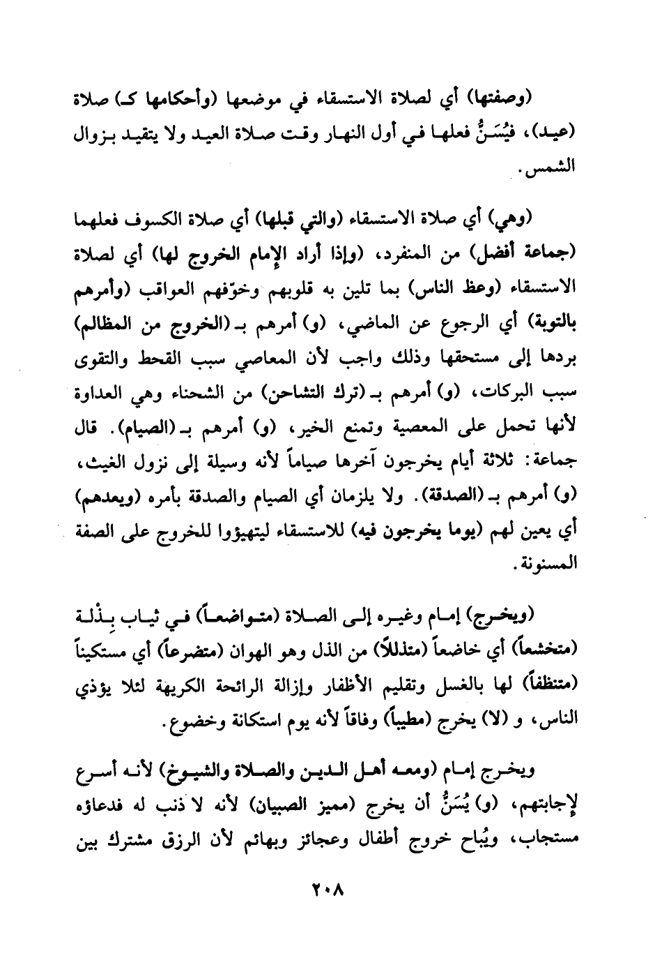 وصفتها أَي لصَلَاة الاسْتِسْقَاء فِي موضعهَا. وأحكامها ك صَلَاة عيد، فَيسنّ فعلهَا أول النَّهَار وَقت صَلَاة الْعِيد، وَلَا يتَقَيَّد بِزَوَال الشَّمْس. وَهِي أَي صَلَاة الاسْتِسْقَاء وَالَّتِي قبلهَا أَي صَلَاة الْكُسُوف فعلهمَا جمَاعَة أفضل من الْمُنْفَرد وَإِذا أَرَادَ الإِمَام الْخُرُوج لَهَا أَي صَلَاة الاسْتِسْقَاء وعظ النَّاس بِمَا تلين بِهِ قُلُوبهم وخوفهم العواقب وَأمرهمْ بِالتَّوْبَةِ أَي الرُّجُوع عَن الْمعاصِي وَأمرهمْ بِالْخرُوجِ من الْمَظَالِم بردهَا إِلَى مستحقها وَذَلِكَ وَاجِب لِأَن الْمعاصِي سَبَب الْقَحْط وَالتَّقوى سَبَب البركات وَأمرهمْ ب ترك التشاحن من الشحن وَهُوَ الْعَدَاوَة لِأَنَّهَا تحمل على الْمعْصِيَة وتمنع الْخَيْر وَأمرهمْ ب الصّيام قَالَ جمَاعَة: ثَلَاثَة أَيَّام يخرجُون آخرهَا صياما لِأَنَّهُ وَسِيلَة إِلَى نزُول الْغَيْث وَأمرهمْ ب الصَّدَقَة. وَلَا يلزمان أَي الصّيام وَالصَّدَََقَة بأمرهم ويعدهم أَي يعين لَهُم يَوْمًا يخرجُون فِيهِ للاستسقاء يتهيأ لِلْخُرُوجِ على الصّفة المسنونة وَيخرج إِمَام وَغَيره إِلَى الصَّلَاة متواضعا فِي ثِيَاب بذلة متخشعا أَي خاضعا متذللا من الذل وَهُوَ الهوان متضرعا أَي مستكينا