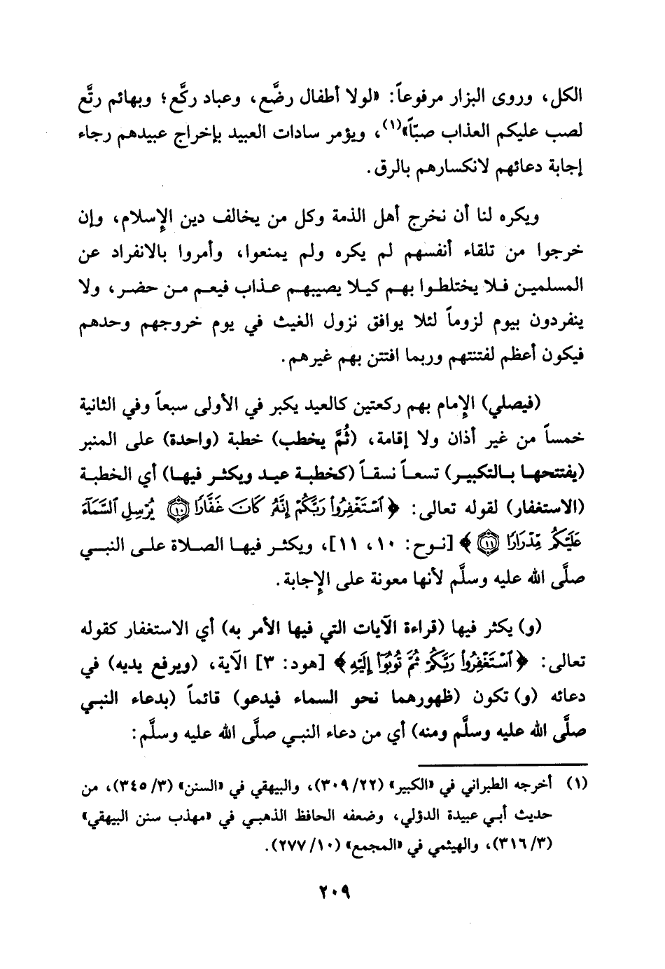 الْكل، وروى الْبَزَّار مَرْفُوعا (لَوْلَا أَطْفَال رضع، وَعباد ركع، وبهائم رتع لصب عَلَيْكُم الْعَذَاب صبا) وَيُؤمر سَادَات العبيد بِإِخْرَاج عبيدهم رَجَاء إِجَابَة دُعَائِهِمْ لانكسارهم بِالرّقِّ، وَيكرهُ لنا أَن نخرج أهل الذِّمَّة وكل من يُخَالف دين الْإِسْلَام، وَإِن خَرجُوا من تِلْقَاء أنفسهم لم يكره وَلم يمنعوا، وَأمرُوا بالانفراد عَن الْمُسلمين فَلَا يختلطوا بهم كَيْلا يصيبهم عَذَاب فَيعم من حضر، وَلَا ينفردون بِيَوْم لُزُوما لِئَلَّا يُوَافق نزُول الْغَيْث فِي يَوْم خُرُوجهمْ وحدهم فَيكون أعظم لفتنتهم، وَرُبمَا افْتتن بهم غَيرهم فَيصَلي الإِمَام بهم رَكْعَتَيْنِ كالعيد يكبر فِي الأولى سبعا وَالثَّانيَِة خمْسا من غير أَذَان وَلَا إِقَامَة، ثمَّ يخْطب خطْبَة وَاحِدَة على الْمِنْبَر يفتتحها بِالتَّكْبِيرِ تسعا نسقا كخطبة عيد وَيكثر فِيهَا أَي الْخطْبَة الاسْتِغْفَار لقَوْله تَعَالَى ١٩ ((اسْتَغْفرُوا ربكُم إِنَّه كَانَ غفارًا يُرْسل السَّمَاء عَلَيْكُم مدرارا)) وَيكثر فِيهَا الصَّلَاة على النَّبِي لِأَنَّهَا مَعُونَة على الْإِجَابَة، وَيكثر فِيهَا قِرَاءَة الْآيَات الَّتِي فِيهَا الْأَمر بِهِ أَي الاسْتِغْفَار كَقَوْلِه تَعَالَى ١٩ ((وَاسْتَغْفرُوا ربكُم ثمَّ تُوبُوا إِلَيْهِ)) الْآيَة، وَيرْفَع يَدَيْهِ فِي دُعَائِهِ وَتَكون ظهورهما نَحْو السَّمَاء فيدعو قَائِما بِدُعَاء النَّبِي صلى الله عَلَيْهِ وَسلم وَمِنْه أَي من دُعَاء النَّبِي صلى الله عَلَيْهِ وَسلم: