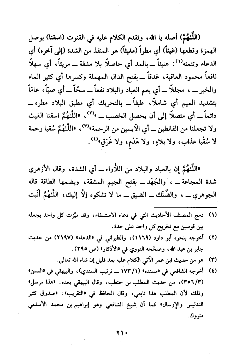 اللَّهُمَّ أَصله يَا ألله، وَتقدم الْكَلَام عَلَيْهِ فِي الْقُنُوت اسقنا بوصل الْهمزَة وقطعها غيثا أَي مَطَرا مغيثا هُوَ المنقذ من الشدَّة إِلَى آخِره أَي الدُّعَاء وتتمته: هَنِيئًا الْمَدّ أَي حَاصِلا بِلَا مشقة مريئا، أَي سهلا نَافِعًا مَحْمُود الْعَافِيَة، غدقا بِفَتْح الدَّال الْمُهْملَة وَكسرهَا أَي كثير المَاء مجللا السَّحَاب الَّذِي يعم الْعباد والبلاد نفعا، سَحا أَي صبا، عَاما بتَشْديد الْمِيم أَي شَامِلًا، طبقًا بِالتَّحْرِيكِ طبق الْبِلَاد مطره دَائِما أَي مُتَّصِلا إِلَى أَن يحصل الخصب اللَّهُمَّ اسقنا الْغَيْث وَلَا تجعلنا من القانطين أَي الآيسين من الرَّحْمَة، اللَّهُمَّ سقيا رَحْمَة لَا سقيا عَذَاب وَلَا بلَاء وَلَا هدم وَلَا غرق، اللَّهُمَّ إِن بالعباد والبلاد من اللأواء أَي الشدَّة، وَقَالَ الْأَزْهَرِي: شدَّة الْجَمَاعَة، والجهد، فتح الْجِيم الْمَشَقَّة وَبِضَمِّهَا الطَّاقَة قَالَه الْجَوْهَرِي، والضنك: الضّيق مَالا نشكوه إِلَّا إِلَيْك، اللَّهُمَّ أنبت