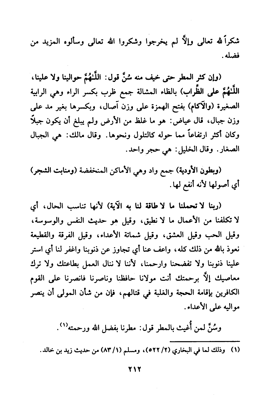 شكرا لله تَعَالَى وَإِلَّا لم يخرجُوا وشكروا الله تَعَالَى وسألوه الْمَزِيد من فَضله. وَإِن كثر الْمَطَر حَتَّى خيف مِنْهُ سنّ قَول: اللَّهُمَّ حوالينا وَلَا علينا، اللَّهُمَّ على الظراب بالظاء المشالة جمع ظرب بِكَسْر الرَّاء وَهِي الرابية الصَّغِيرَة والآكام بِفَتْح الْهمزَة على وزن آصال، وبكسرها بِغَيْر مد على وزن جبال، قَالَ عِيَاض: هُوَ مَا غلظ من الأَرْض وَلم يبلغ أَن يكون جبلا وَكَانَ أَكثر ارتفاعا مِمَّا حوله كالتلول وَنَحْوهَا. وَقَالَ الْخَلِيل: هِيَ حجر وَاحِد وبطون الأودية جمع وَاد وَهِي الْأَمَاكِن المنخفضة ومنابت الشّجر أَي أُصُولهَا لِأَنَّهُ أَنْفَع لَهَا رَبنَا لَا تحملنا مَالا طَاقَة لنا بِهِ الْآيَة لِأَنَّهَا تناسب الْحَال أَي لَا تكلفنا من الْأَعْمَال مَالا نطيق، وَقيل هُوَ حَدِيث النَّفس والوسوسة، وَقيل الْحبّ، وَقيل الْعِشْق، وَقيل شماتة الْأَعْدَاء، وَقيل الْفرْقَة القطيعة نغوذ بِاللَّه من ذَلِك (واعف عَنَّا) أَي تجَاوز عَن ذنوبنا (واغفر لنا) أَي اسْتُرْ علينا ذنوبنا وَلَا تفضحنا (وارحمنا) لأننا لَا ننال الْعَمَل تطاعتك وَلَا ترك مَعَاصِيك إِلَّا بِرَحْمَتك (أَنْت مَوْلَانَا) حافظنا وناصرنا (فَانْصُرْنَا على الْقَوْم الْكَافرين) بِإِقَامَة الْحجَّة وَالْغَلَبَة فِي قِتَالهمْ، فَإِن من شَأْن الْمولى أَن ينصر موَالِيه على الْأَعْدَاء. وَسن لمن أغيث بالمطر قَول: مُطِرْنَا بِفضل الله وَرَحمته.
