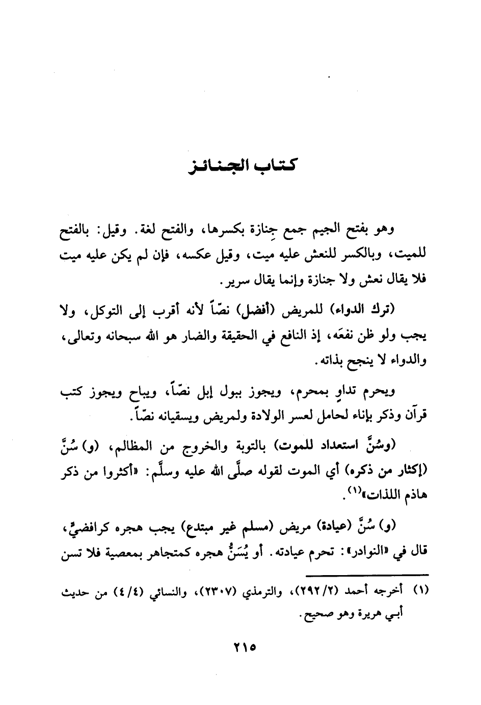 . وَهُوَ بِفَتْح الْجِيم جمع جَنَازَة بِكَسْرِهَا، وَالْفَتْح لُغَة. وَقيل بِالْفَتْح للْمَيت، وبالكسر النعش عَلَيْهِ ميت، وَقيل عَكسه، فَإِن لم يكن عَلَيْهِ فَلَا يُقَال نعش وَلَا جَنَازَة وَإِنَّمَا يُقَال سَرِير. ترك الدَّوَاء للْمَرِيض أفضل نصا لِأَنَّهُ أقرب إِلَى التَّوَكُّل، وَلَا يجب وَلَو ظن نَفعه، إِذْ النافع فِي الْحَقِيقَة والضار هُوَ الله سُبْحَانَهُ وَتَعَالَى، والدواء لَا ينجع بِذَاتِهِ. وَيحرم تداو بِمحرم، وَيجوز ببول إبل نصا، وَيُبَاح وَيجوز كتب قُرْآن وَذكر بِإِنَاء لحامل لعسر الْولادَة ولمريض ويسقيانه نصا. وَسن استعداد للْمَوْت بِالتَّوْبَةِ وَالْخُرُوج من الْمَظَالِم وَسن إكثار من ذكره أَي الْمَوْت لقَوْله (أَكْثرُوا من ذكر هاذم اللَّذَّات) وَسن عِيَادَة مَرِيض مُسلم غير مُبْتَدع يجب هجره كرافضي، قَالَ فِي النَّوَادِر: تحرم عيادته. أَو يسن هجره كمتجاهر بِمَعْصِيَة (هَذِه الْكَلِمَة غير مَوْجُودَة فِي هَذِه الْفَقْرَة فِي الْكتاب: يُعَاد) فَلَا تسن