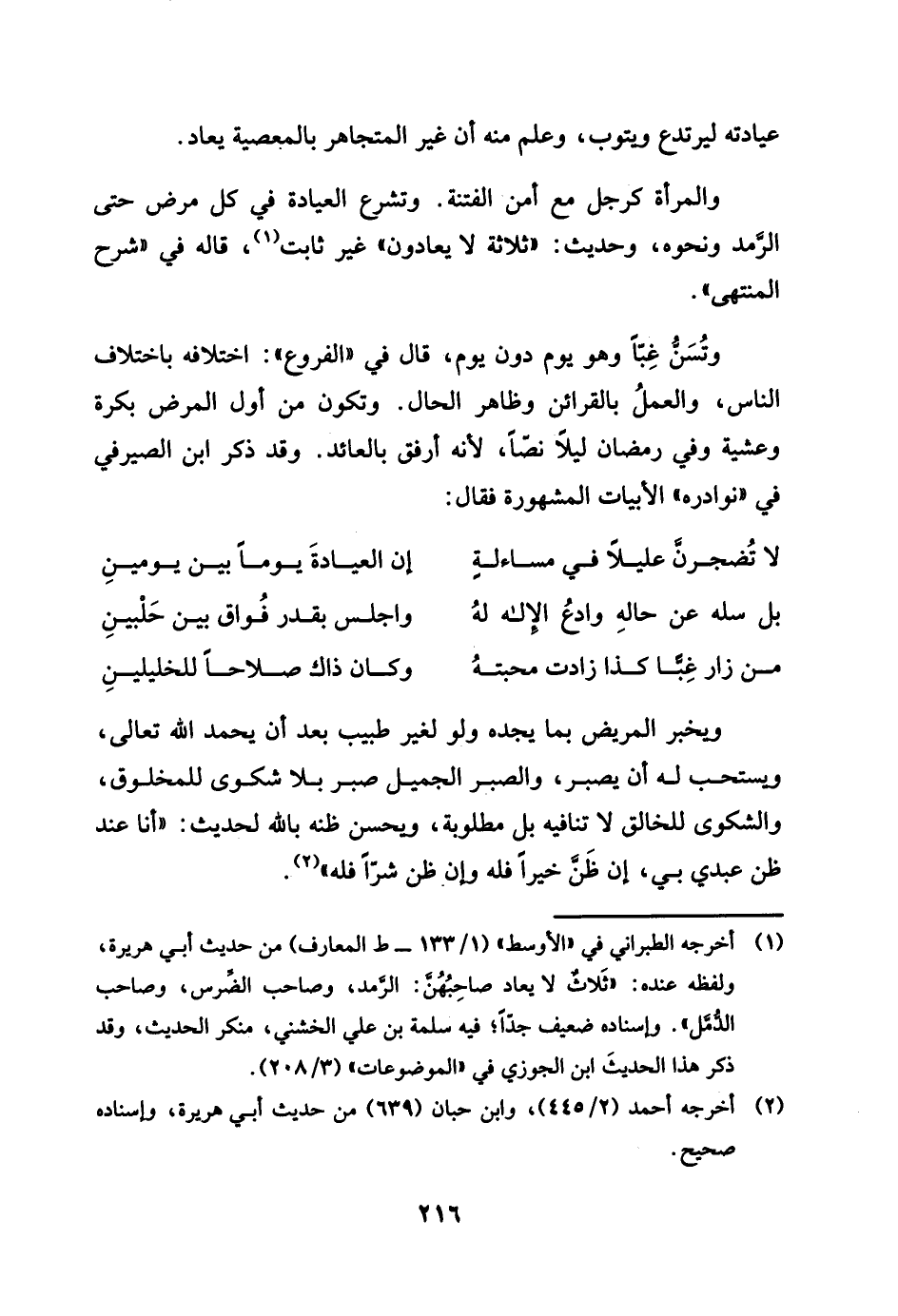 عيادته ليرتدع وَيَتُوب، وَعلم مِنْهُ أَن غير المتجاهر بالمعصية يُعَاد. وَالْمَرْأَة كَرجل مَعَ أَمن الْفِتْنَة. وتشرع العيادة فِي كل مرض حَتَّى الرمد وَنَحْوه، وَحَدِيث: (ثَلَاثَة لَا يعادون) غير ثَابت، قَالَه فِي شرح الْمُنْتَهى. وَتسن غبا وَهُوَ يَوْم دون يَوْم، قَالَ فِي الْفُرُوع: اختلافه باخْتلَاف النَّاس وَالْعلم بالقرائن وَظَاهر الْحَال. وَتَكون من أول الْمَرَض بكرَة وَعَشِيَّة وَفِي رَمَضَان لَيْلًا نصا، لِأَنَّهُ أرْفق بالعائد. وَقد ذكر ابْن الصير فِي نوادره الأبيات الْمَشْهُورَة فَقَالَ: