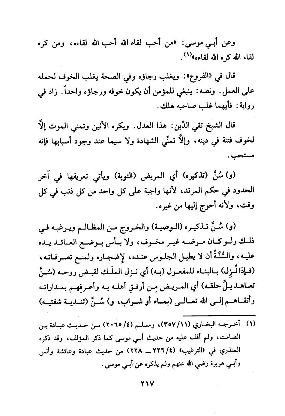 وَعَن أبي مُوسَى (وَمن أحب لِقَاء الله أحب الله لقاءه وَمن كره لِقَاء الله كره الله لقاءه) قَالَ فِي الْفُرُوع: ويغلب رجاؤه وَفِي الصِّحَّة يغلب الْخَوْف لحمله على الْعَمَل. وَنَصه يَنْبَغِي لِلْمُؤمنِ أَن يكون خَوفه ورجاؤه وَاحِدًا. زَاد فِي رِوَايَة: فَأَيّهمَا غلب صَاحبه هلك. قَالَ الشَّيْخ ١٦ (تَقِيّ الدّين) : هَذَا الْعدْل. وَيكرهُ الأنين وتمني الْمَوْت إِلَّا لخوف فتْنَة فِي دينه، وَإِلَّا تمنى الشَّهَادَة وَلَا سِيمَا عِنْد وجود أَسبَابهَا فَإِنَّهُ مُسْتَحبّ وَسن تذكيره الْمَرِيض التَّوْبَة وَيَأْتِي تَعْرِيفهَا فِي آخر الْحُدُود فِي حكم الْمُرْتَد، لِأَنَّهَا وَاجِبَة على كل وَاحِد من كل ذَنْب فِي كل وَقت، وَلِأَنَّهُ أحْوج من غَيره وَسن تذكيره الْوَصِيَّة وَالْخُرُوج من الْمَظَالِم ويرغبه فِي ذَلِك وَلَو كَانَ مَرضه غير مخوف، وَلَا بَأْس بِوَضْع الْعَائِد يَده عَلَيْهِ، وَالسّنة لَا يُطِيل الْجُلُوس عِنْده لإضجاره ولمنع تَصَرُّفَاته، فَإِذا نزل بِالْبِنَاءِ للْمَفْعُول بِهِ أَي نزل الْملك لقبض روحه سنّ تعاهد بل حلقه الْمَرِيض من أرْفق أَهله بِهِ وأعرفهم بمداواته وأتقاهم إِلَى الله بِمَاء أَو شراب، وَسن تندية شَفَتَيْه