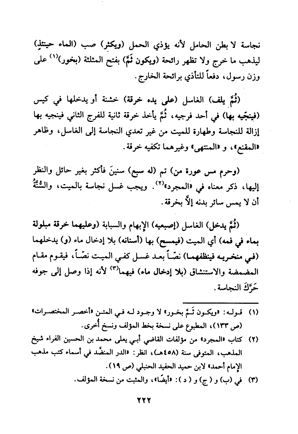 نَجَاسَة لَا بطن الْحَامِل لِأَنَّهُ يُؤْذِي الْحمل وَيكثر صب المَاء حِينَئِذٍ ليذْهب مَا خرج وَلَا تظهر رَائِحَة وَيكون ثمَّ بِفَتْح الْمُثَلَّثَة بخور على وزن رَسُول دفعا للتأذي برائحة الْخَارِج ثمَّ يلف الْغَاسِل على يَده خرقَة خشنة أَو يدخلهَا فِي كيس فينجيه بهَا أَي فِي أحد فرجيه ثمَّ يَأْخُذ خرقَة ثَانِيَة لِلْفَرجِ الثَّانِي فينجيه بهَا إِزَالَة للنَّجَاسَة وطهارة للْمَيت من غير تعدِي النَّجَاسَة إِلَى الْغَاسِل، وَظَاهر الْمقنع والمنتهى وَغَيرهمَا تكفيه خرقَة وَحرم مس عَورَة من تمّ لَهُ سبع سِنِين فَأكْثر بِغَيْر حَائِل وَالنَّظَر إِلَيْهَا، ذكر مَعْنَاهُ فِي الْمُجَرّد. وَيجب غسل نَجَاسَة بِالْمَيتِ، وَالسّنة أَن لَا يمس سَائِر بدنه إِلَّا بِخرقَة ثمَّ يدْخل الْغَاسِل إصبعيه الْإِبْهَام والسبابة وَعَلَيْهِمَا خرقَة مبلولة فِي فَمه أَي الْمَيِّت فيمسح بهَا أَسْنَانه بِلَا إِدْخَال مَاء ويدخلهما فِي مَنْخرَيْهِ فينظفهما نصا بعد غسل كفي الْمَيِّت نصا، فَيقوم مقَام الْمَضْمَضَة وَالِاسْتِنْشَاق بِلَا إِدْخَال مَاء لِأَنَّهُ إِذا وصل إِلَى جَوْفه حرك النَّجَاسَة