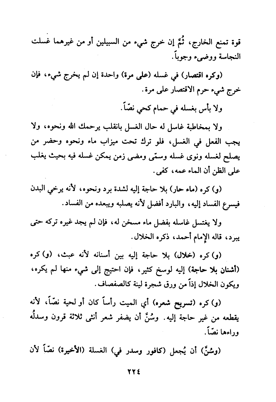 لَا بَأْس بِغسْلِهِ فِي حمام محمى نصا. وَلَا بمخاطبة غاسل لَهُ حَال الْغسْل ب (انْقَلب يَرْحَمك الله) وَنَحْوه، وَلَا يجب الْفِعْل فِي الْغسْل فَلَو ترك تَحت ميزاب مَاء وَنَحْوه وَحضر من يصلح لغسله وَنوى غسله وسمى وَمضى زمن يُمكن غسله فِيهِ بِحَيْثُ يغلب على الظَّن أَن المَاء عَمه، كفى. وَكره مَاء حَار بِلَا حَاجَة إِلَيْهِ شدَّة برد وَنَحْوه لِأَنَّهُ يُرْخِي الْبدن فيسرع الْفساد إِلَيْهِ. والبارد أفضل لِأَنَّهُ يصلبه ويبعده من الْفساد. وَلَا يغْتَسل غاسل بِفضل مَاء مسخن لَهُ فَإِن لم يجد غَيره تَركه حَتَّى يبرد قَالَه الإِمَام أَحْمد، ذكره الْخلال، وَكره خلال بِلَا حَاجَة إِلَيْهِ بَين أَسْنَانه لِأَنَّهُ عَبث وَكره أشنان بِلَا حَاجَة إِلَيْهِ لوسخ كثير، فَإِن احْتِيجَ إِلَى شَيْء مِنْهَا لم يكره وَيكون الْخلال إِذن من ورق شَجَرَة لينَة كالصفصاف وَكره تَسْرِيح شعره أَي الْمَيِّت رَأْسا كَانَ أَو لحية نصا، لِأَنَّهُ يقطعهُ من غير حَاجَة إِلَيْهِ. وَسن أَن يضفر شعر أُنْثَى ثَلَاثَة قُرُون وسدله وَرَاءَهَا نصا. وَسن أَن يَجْعَل كافور وَسدر فِي الغسلة الْأَخِيرَة نصا،
