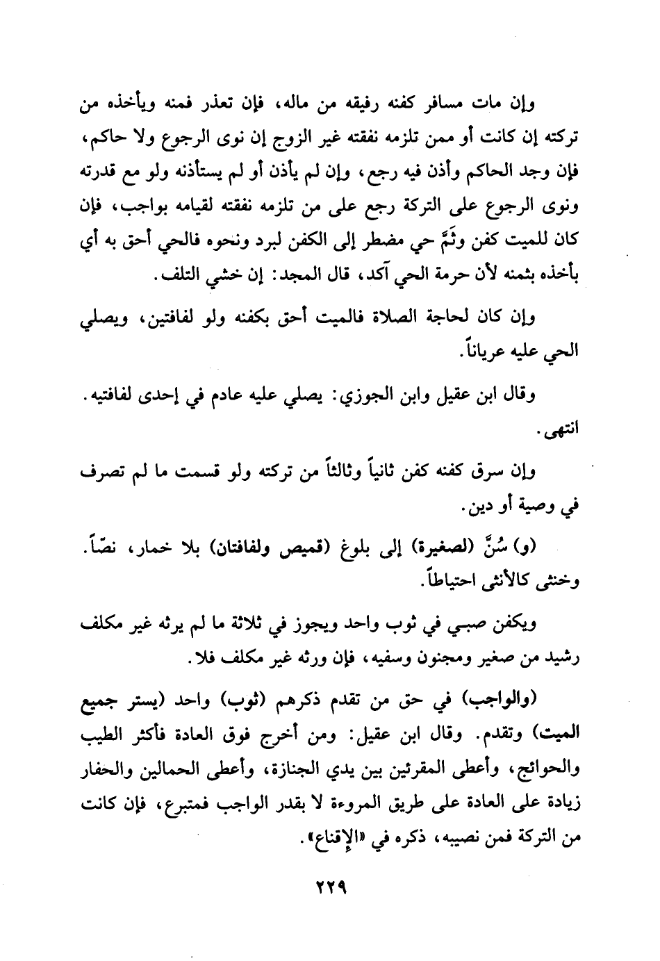 وَإِن مَاتَ مُسَافر كَفنه رَفِيقه من مَاله، فَإِن تعذر فَمِنْهُ وَيَأْخُذهُ من تركته إِن كَانَت أَو مِمَّن تلْزمهُ نَفَقَته غير الزَّوْج إِن نوى الرُّجُوع وَلَا حَاكم فَإِن وجد الْحَاكِم وَأذن فِيهِ رَجَعَ، وَإِن لم يَأْذَن أَو لم يَسْتَأْذِنهُ وَلَو مَعَ قدرته وَنوى الرُّجُوع على التَّرِكَة رَجَعَ على من تلْزمهُ نَفَقَته لقِيَامه بِوَاجِب، فَإِن كَانَ للْمَيت كفن وَثمّ حَيّ مُضْطَر إِلَى الْكَفَن لبرد وَنَحْوه فالحي أَحَق بِهِ أَي بِأَخْذِهِ بِثمنِهِ لِأَن حُرْمَة الْحَيّ آكِد، قَالَ الْمجد: إِن خشِي التّلف. وَإِن كَانَ لحَاجَة الصَّلَاة فالميت أَحَق بكفنه وَلَو لفافتين، وَيُصلي الْحَيّ عَلَيْهِ عُريَانا. وَقَالَ ابْن عقيل وَابْن الْجَوْزِيّ: يُصَلِّي عَلَيْهِ عادم فِي إِحْدَى لفافتيه. انْتهى. وَإِن سرق كَفنه كفن ثَانِيًا وثالثا من تركته وَلَو قسمت مَا لم تصرف فِي وَصيته أَو دين. وَسن لصغيرة إِلَى بُلُوغ قَمِيص ولفافتان بِلَا خمار، نصا. وَخُنْثَى كالأنثى احْتِيَاطًا. يُكفن صبي فِي ثوب وَاحِد وَيجوز فِي ثَلَاثَة مَا لم يَرِثهُ غير مُكَلّف رشيد من صَغِير مَجْنُون وسفيه، فَإِن وَرثهُ غير مُكَلّف فَلَا. وَالْوَاجِب فِي حق من تقدم ذكرهم ثوب وَاحِد بستر جَمِيع الْمَيِّت وَتقدم. وَقَالَ ابْن عقيل: وَمن أخرج فَوق الْعَادة فَأكْثر الطّيب والحوائج وَأعْطى المقرئين بَين يَدي الْجِنَازَة وَأعْطى الحمالين والحفار زِيَادَة على الْعَادة على طَرِيق الْمُرُوءَة لَا بِقدر الْوَاجِب فمتبرع، فَإِن كَانَت من التَّرِكَة فَمن نصِيبه. ذكره فِي الْإِقْنَاع.