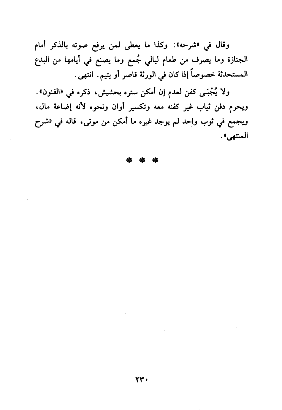 وَقَالَ فِي شَرحه: وَكَذَا مَا يعْطى لمن يرفع صَوته بِالذكر أَمَام الْجِنَازَة وَمَا يصرف من طَعَام وَنَحْوه ليَالِي جمع وَمَا يصنع فِي أَيَّامهَا من الْبدع المستحدثة خُصُوصا إِذا كَانَ فِي الْوَرَثَة قَاصِر أَو يَتِيم. انْتهى. وَلَا يجبى كفن لعدم إِن أمكن ستره بحشيش ذكره فِي الْفُنُون. وَيحرم دفن ثِيَاب غير كَفنه مَعَه وتكسير أَوَان وَنَحْوه لِأَنَّهُ إِضَاعَة مَال، وَيجمع فِي ثوب وَاحِد لم يُوجد غَيره مَا أمكن من موتى، قَالَه فِي شرح الْمُنْتَهى.