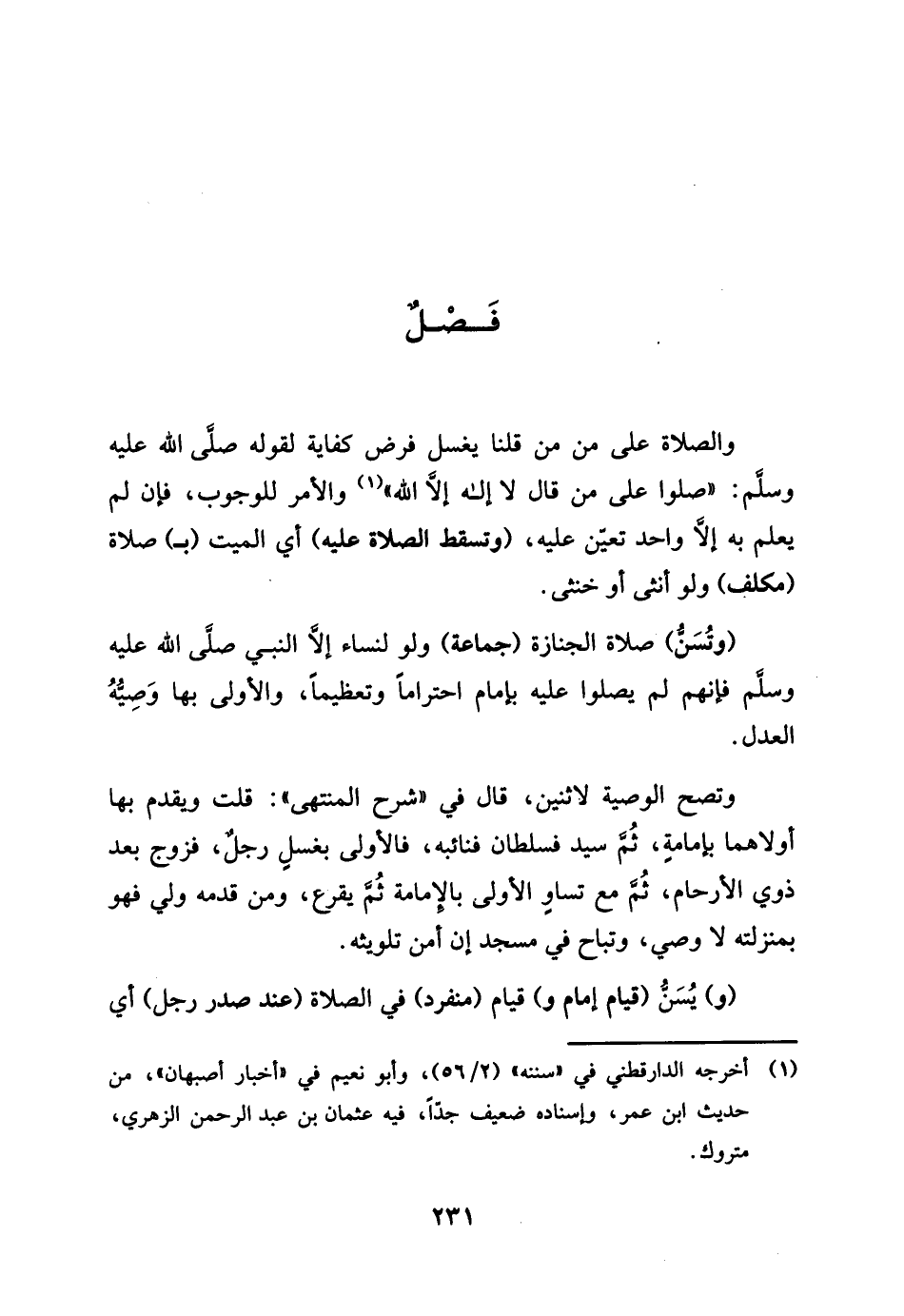 . وَالصَّلَاة على من قُلْنَا يغسل فرض كِفَايَة لقَوْله (صلوا على من قَالَ لَا إِلَه إِلَّا الله) وَالْأَمر للْوُجُوب، فَإِن لم يعلم بِهِ إِلَّا وَاحِد تعين عَلَيْهِ، وَتسقط الصَّلَاة عَلَيْهِ أَي الْمَيِّت ب صَلَاة مُكَلّف وَلَو أُنْثَى أَو خُنْثَى. وَتسن صَلَاة الْجِنَازَة جمَاعَة وَلَو نسَاء إِلَّا النَّبِي فَإِنَّهُم لم يصلوا عَلَيْهِ بِإِمَام احتراما وتعظيما، وَالْأولَى بهَا وَصِيَّة الْعدْل. وَتَصِح الْوَصِيَّة لاثْنَيْنِ. قَالَ فِي شرح الْمُنْتَهى. قلت بهَا أولاهما فِي إِمَامَة ثمَّ سيد فسلطان فنائبه فَالْأولى بِغسْل رجل، فزوج بعد ذَوي الْأَرْحَام، ثمَّ تساو الأولى بِالْإِمَامَةِ ثمَّ يقرع، وَمن قدمه ولى فَهُوَ بِمَنْزِلَتِهِ لَا وَصِيّ، وتباح فِي مَسْجِد إِن أَمن تلويثه. وَيسن قيام إِمَام وَقيام مُنْفَرد فِي الصَّلَاة عِنْد صدر رجل أَي