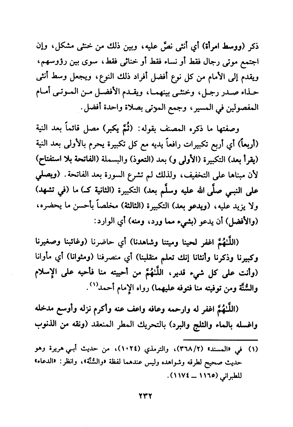 ذكر ووسط امْرَأَة أَي أُنْثَى نَص عَلَيْهِ، وَبَين ذَلِك من خُنْثَى مُشكل، وَإِن اجْتمع موتى رجال فَقَط أَو نسَاء فَقَط أَو خناثي فَقَط، سوى بَين رُؤْسهمْ، وَيقدم إِلَى الإِمَام من كل نوع أفضل أَفْرَاد ذَلِك النَّوْع، وَيجْعَل وسط أُنْثَى حذاء صدر رجل وَخُنْثَى بَينهمَا، وَيقدم الْأَفْضَل من الْمَوْتَى أما المفضولين فِي الْمسير، وَجمع الْمَوْتَى بِصَلَاة وَاحِدَة أفضل. وصفتها مَا ذكره المُصَنّف بقوله: ثمَّ يكبر مصل نَائِما بعد النِّيَّة أَرْبعا أَي أَربع تَكْبِيرَات رَافعا يَدَيْهِ مَعَ كل تَكْبِيرَة يقْرَأ بعد التَّكْبِيرَة الأولى وَبعد التَّعَوُّذ والبسملة الْفَاتِحَة بِلَا استفتاح لِأَن مبناها على التَّخْفِيف، وَلذَلِك لم تشرع السُّورَة بعد الْفَاتِحَة. وَيصلى على النَّبِي بعد التَّكْبِيرَة الثَّانِيَة كَمَا فِي تشهد وَلَا يزِيد عَلَيْهِ، وَيَدْعُو بعد التَّكْبِيرَة الثَّالِثَة مخلصا بِأَحْسَن مَا يحضرهُ وَالْأَفْضَل أَن يَدْعُو بِشَيْء مِمَّا ورد، وَمِنْه: أَي الْوَارِد اللَّهُمَّ اغْفِر لحينا وميتنا وشاهدنا أَي حاضرنا وغائبنا وصغيرنا وَكَبِيرنَا وذكرناوأنثانا إِنَّك تعلم منقلبنا أَي منصرفنا ومثوانا أَي مأوانا وَأَنت على كل شَيْء قدير، اللَّهُمَّ من أحييته منا فأحيه على الْإِسْلَام وَالسّنة وَمن توفيته منا فتوفه عَلَيْهَا رَوَاهُ الإِمَام أَحْمد اللَّهُمَّ اغْفِر لَهُ وارحمه وعافه واعف عَنهُ وَأكْرم نزله وأوسع مدخله واغسله بِالْمَاءِ والثلج وَالْبرد بِالتَّحْرِيكِ الْمَطَر المنعقد ونقه من الذُّنُوب