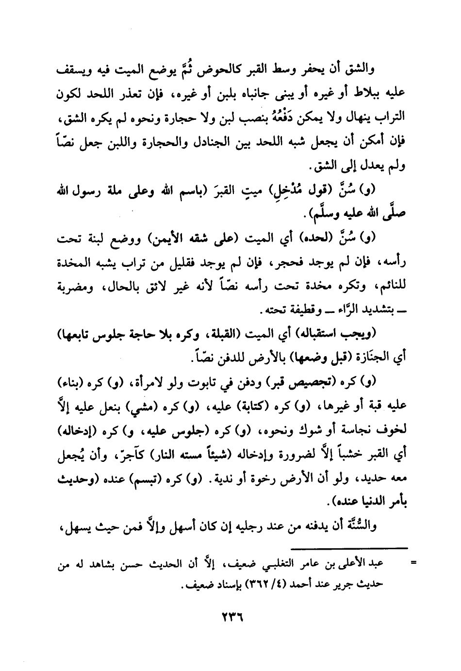 والشق أَن يحْفر وسط الْقَبْر كالحوض ثمَّ يوضع الْمَيِّت فِيهِ ويسقف عَلَيْهِ ببلاط أَو غَيره أَو يبْنى جانباه بِلَبن أَو غَيره، فَإِن تعذر اللَّحْد لكَون التُّرَاب ينهال وَلَا يُمكن رَفعه بِنصب لبن وَلَا حِجَارَة وَنَحْوه لم يكره الشق، فَإِن أمكن أَن يَجْعَل شبه اللَّحْد بَين الجنادل وَالْحِجَارَة وَاللَّبن جعل نصا وَلم يعدل إِلَى الشق وَسن قَول مدْخل ميت الْقَبْر باسم الله وعَلى مِلَّة رَسُول الله وَسن لحده أَي الْمَيِّت على شقَّه الْأَيْمن وَوضع لبنة تَحت رَأسه فَإِن لم يُوجد فحجر، فَإِن لم يُوجد فقليل من تُرَاب يشبه المخدة للنائم وَتكره مخدة تَحت رَأسه نصا لِأَنَّهُ غير لَائِق بِالْحَال، ومضربة بتَشْديد الرَّاء وقطيفة تَحْتَهُ وَيجب استقباله أَي الْمَيِّت الْقبْلَة، وَكره بِلَا حَاجَة جُلُوس تابعها أَي الْجِنَازَة قبل وَضعهَا بِالْأَرْضِ للدفن نصا، وَكره تجصيص قبر وَدفن فِي تَابُوت وَلَو لامْرَأَة، وَكره بِنَاء عَلَيْهِ قبَّة أَو غَيرهَا وَكره كِتَابَة عَلَيْهِ، وَكره مشي بنعل عَلَيْهِ إِلَّا لخوف نَجَاسَة أَو شوك، وَكره جُلُوس عَلَيْهِ، وَكره إِدْخَاله أَي الْقَبْر خشما إِلَّا لضَرُورَة إِدْخَاله شَيْئا مسته النَّار كآجر، وَأَن يَجْعَل حَدِيد، وَلَو أَن الأَرْض رخوة أَو ندية، وَكره تَبَسم عِنْده وَحَدِيث بِأَمْر الدُّنْيَا عِنْده وَالسّنة أَن يدفنه من عِنْد رجلَيْهِ إِن كَانَ أسهل وَإِلَّا فَمن حَيْثُ يسهل،