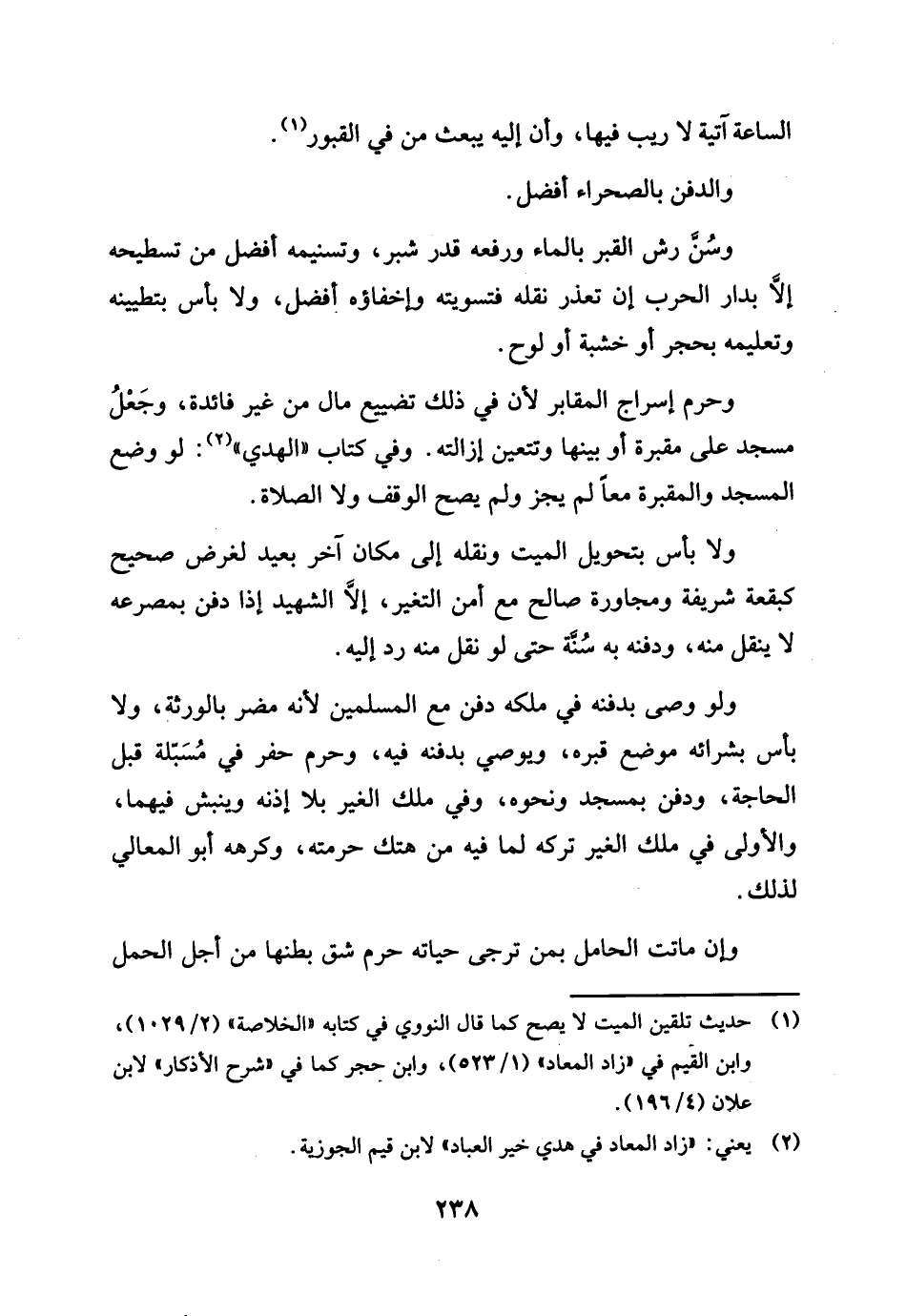 السَّاعَة آتِيَة لَا ريب فِيهَا، وَأَن إِلَيْهِ يبْعَث من فِي الْقُبُور. والدفن بالصحراء أفضل، وَسن رش الْقَبْر بِالْمَاءِ وَرَفعه قدر شبر، وتسنيمه أفضل من تسطيحه إِلَّا بدار الْحَرْب إِن تعذر نَقله فتسوية وإخفاء أفضل وَلَا بَأْس بتطيينه وتعليمه بِحجر أَو خَشَبَة أَو لوح. وَحرم إسراج الْمَقَابِر لِأَن فِي ذَلِك تَضْييع مَال من غير فَائِدَة، وَجعل مَسْجِد على مَقْبرَة أَو بَينهَا وتتعين إِزَالَته، وَفِي كتاب الْهدى: لَو وضع الْمقْبرَة وَالْمَسْجِد مَعًا لم يجز وَلم يَصح والقف ولاالصلاة، وَلَا بَأْس بتحويل الْمَيِّت وَنَقله إِلَى مَكَان آخر بعيد لغَرَض صَحِيح كبقعة شريفة ومجاورة صَالح مَعَ أَمن التَّغَيُّر إِلَّا الشَّهِيد إِذا دفن بمصرعه لَا ينْقل مِنْهُ، وَدَفنه بِهِ سنة حَتَّى لَو نقل مِنْهُ رد إِلَيْهِ، وَلَو وصّى بدفنه فِي ملكه دفن مَعَ الْمُسلمين لِأَنَّهُ مُضر بالورثة، وَلَا بَأْس بِشِرَائِهِ مَوضِع قَبره، ويوصي بدفنه فِيهِ وَحرم فِي مسبلة قبل الْحَاجة، وَدفن بِمَسْجِد وَنَحْوه، وَفِي ملك الْغَيْر بِلَا إِذْنه وينبش فيهمَا، وَالْأولَى فِي ملك الْغَيْر تَركه لما فِيهِ من هتك حرمته وَكَرِهَهُ أَبُو الْمَعَالِي لذَلِك، وَإِن مَاتَت الْحَامِل بِمن ترجى حَيَاته حرم شقّ بَطنهَا من أجل الْحمل