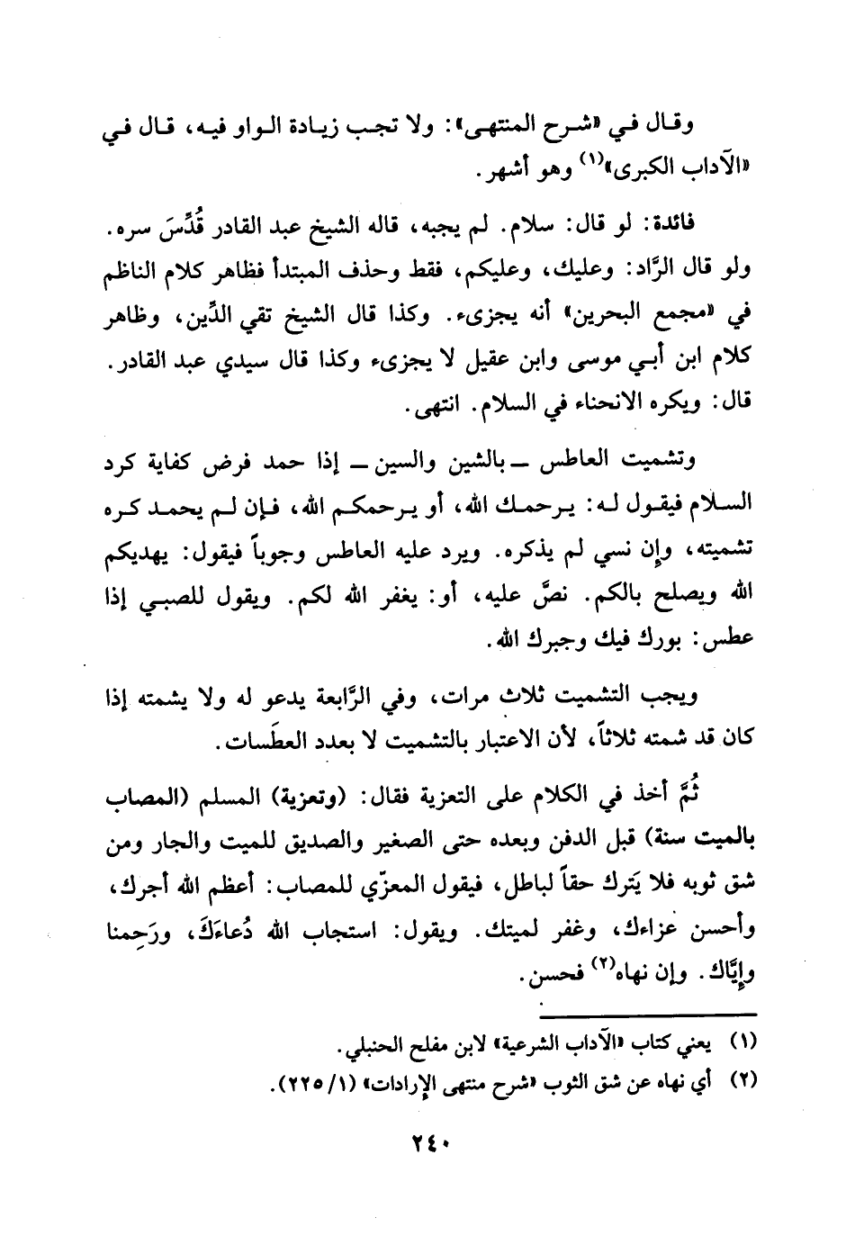 فَائِدَة. لَو قَالَ: سَلام. لمن يجبهُ. قَالَ الشَّيْخ عبد الْقَادِر قدس سره: وَلَو قَالَ الرَّاد: وَعَلَيْك، وَعَلَيْكُم، فَقَط، وَحذف الْمُبْتَدَأ فَظَاهر كَلَام النَّاظِم فِي مجمع الْبَحْرين أَنه يجزىء. وَكَذَا قَالَ الشَّيْخ تَقِيّ الدّين، وَظَاهر كَلَام ابْن أبي مُوسَى وَابْن عقيل لَا يُجزئ وَكَذَا قَالَ سَيِّدي عبد الْقَادِر. قَالَ: وَيكرهُ الانحناء فِي السَّلَام. انْتهى.