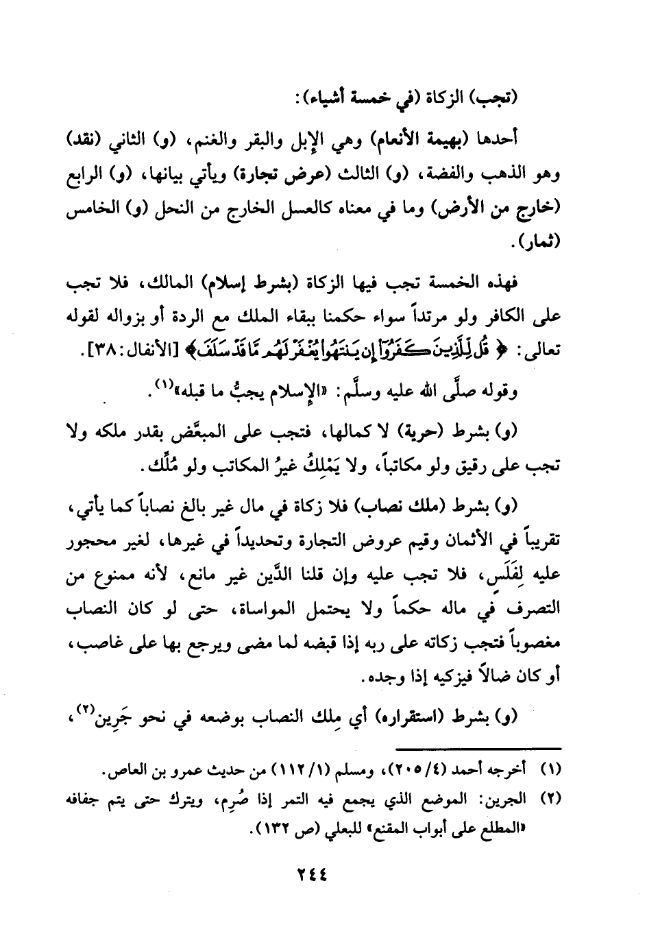 تجب الزَّكَاة فِي خَمْسَة أَشْيَاء: أَحدهَا بَهِيمَة الْأَنْعَام وَهِي الْإِبِل وَالْبَقر وَالْغنم، وَالثَّانِي نقد وَهُوَ الذَّهَب وَالْفِضَّة، وَالثَّالِث عرض تِجَارَة وَيَأْتِي بَيَانهَا، وَالرَّابِع خَارج من الأَرْض وَمَا فِي مَعْنَاهُ كالعسل الْخَارِج من النَّحْل وَالْخَامِس ثمار. فَهَذِهِ الْخَمْسَة تجب فِيهِ الزَّكَاة بِشَرْط إِسْلَام الْمَالِك، فَلَا تجب على الْكَافِر وَلَو مُرْتَدا سَوَاء حكمنَا بِبَقَاء الْملك مَعَ الرِّدَّة أَو بزواله لقَوْله تَعَالَى ١٩ ((قل للَّذين كفرُوا إِن ينْتَهوا يغْفر لَهُم مَا قد سلف)) وَقَوله (الْإِسْلَام يجب مَا قبله) وبشرط حريَّة لإكمالها فَتجب على الْمبعض بِقدر ملكه، وَلَا تجب على رَقِيق وَلَو مكَاتبا، وَلَا يملك غير الْمكَاتب وَلَو ملك. وبشرط ملك نِصَاب فَلَا زَكَاة فِي مَال غير بَالغ نِصَابا كَمَا يَأْتِي، تَقْرِيبًا فِي الْأَثْمَان وقيم عرُوض التِّجَارَة وتحديدا فِي غَيرهَا، لغير مَحْجُور عَلَيْهِ، فَلَا تجب عَلَيْهِ وَإِن قُلْنَا الدّين غير مَانع، لِأَنَّهُ مَمْنُوع من التَّصَرُّف فِي مَاله حكما وَلَا يحْتَمل الْمُوَاسَاة، حَتَّى لَو كَانَ النّصاب مَغْصُوبًا فَتجب زَكَاته على ربه إِذا قَبضه لما مضى وَيرجع بهَا على غَاصِب. أَو كَانَ ضَالًّا فيزكيه إِذا وجده وبشرط استقراره أَي ذَلِك النّصاب بِوَضْعِهِ فِي نَحْو جرين