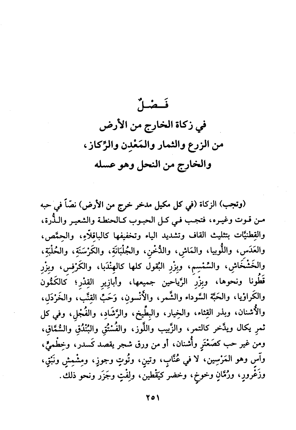 : فِي زَكَاة الْخَارِج من الأَرْض من الزَّرْع وَالثِّمَار والمعدن والركاز وَالْخَارِج من النَّحْل وَهُوَ عسله. وَتجب الزَّكَاة فِي كل مَكِيل مدخر خرج من الأَرْض نصا فِي حبه من قوت وَغَيره فَتجب فِي كل الْحُبُوب كالحنطة وَالشعِير والذرة والقطنيات بِتَثْلِيث الْقَاف وَتَشْديد الْيَاء وتخفيفها كالباقلاء والحمص والعدس واللوبياء والماش والدخن والجلبانة والكرسنة والحلبة والخشخاش والسمسم وبزر الْبُقُول كلهَا كالهندبا والكرفس وبزر قطونا وَنَحْوهَا وبزر الرياحين جَمِيعهَا وأبازير الْقدر كالكمون والكراويا والحبة السَّوْدَاء والشمر والأنيسون وَحب القنب والخردل والأشنان وبذر القثاء وَالْخيَار والبطيخ والرشاد والفجل وَفِي كل ثَمَر يُكَال ويدخر كالتمر وَالزَّبِيب واللوز والفستق والبندق والسماق، وَمن غير حب كصعتر وأشنان، أَو من ورق شجر يقْصد كسدر وخطمى وآسن والمرسين لَا فِي عناب وتين وتوت وَجوز ومشمش ونبق وزعرور ورمان وخوخ، وخضر كيقطين ولفت وجزر وَنَحْو ذَلِك