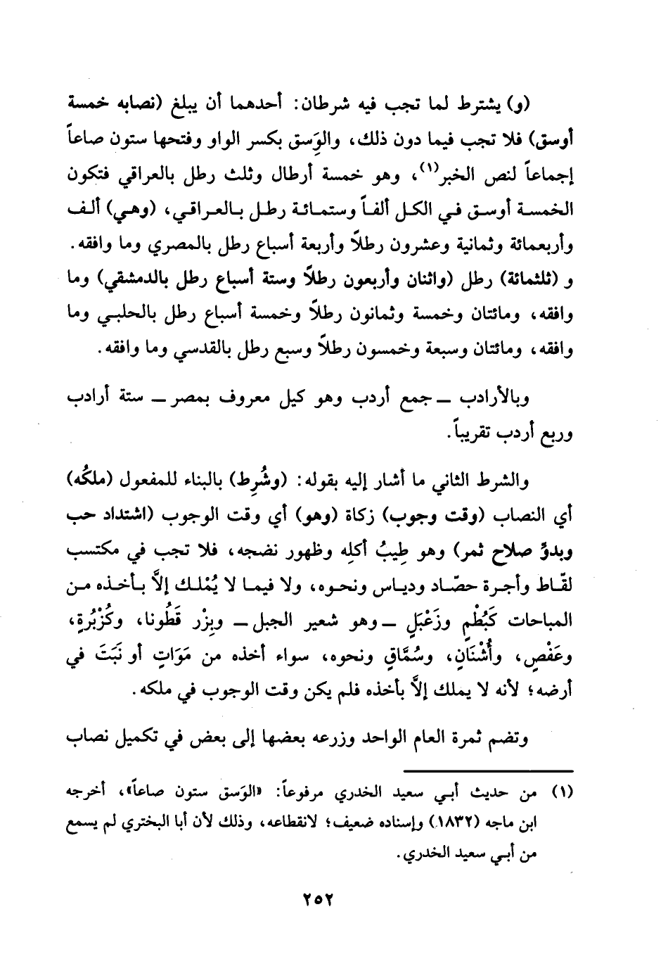 وَيشْتَرط لما تجب فِيهِ شَرْطَانِ أَحدهمَا أَن يبلغ نصابه خَمْسَة أوسق فَلَا تجب فِيمَا دون ذَلِك، والوسق بِكَسْر الْوَاو وَفتحهَا سِتُّونَ صَاعا إِجْمَاعًا لنَصّ الْخَبَر، وَهُوَ خَمْسَة أَرْطَال وَثلث بالعراقي، فَيكون الْخَمْسَة أوسق فِي الْكل ألفا وسِتمِائَة رَطْل بالعراقي، وَهِي ألف وَأَرْبَعمِائَة وَثَمَانِية وَعِشْرُونَ رطلا وَأَرْبَعَة أَسْبَاع رَطْل بالمصري وَمَا وَافقه. وثلثمائة رَطْل وَاثْنَانِ وَأَرْبَعُونَ رطلا وَسِتَّة أَسْبَاع رَطْل بالدمشقي وَمَا وَافقه، ومائتان وَخَمْسَة وَثَمَانُونَ رطلا وَخَمْسَة أَسْبَاع رَطْل بالحلبي وَمَا وَافقه، ومائتان وَسَبْعَة وَخَمْسُونَ رطلا وَسبع رَطْل بالقدسي وَمَا وَافقه. وبالأرادب جمع أردب وَهُوَ كيل مَعْرُوف بِمصْر سِتَّة أرادب وَربع أردب تَقْرِيبًا. وَالشّرط الثَّانِي مَا أَشَارَ إِلَيْهِ بقوله وَشرط بِالْبِنَاءِ للْمَفْعُول ملكه أَي النّصاب وَقت وجوب زَكَاة وَهُوَ أَي وَقت الْوُجُوب اشتداد حب وبدو صَلَاح ثَمَر وَهُوَ طيب أكله وَظُهُور نضجه فَلَا تجب فِي مكتسب لقاط وَأُجْرَة حصاد ودياس وَنَحْوه وَلَا فِيمَا يملك إِلَّا بِأَخْذِهِ من الْمُبَاحَات كبطم وزعبل وَهُوَ شعير الْجَبَل وبزر قطونا وكزبرة وعفص وأشنان وسماق سَوَاء أَخذه من موَات أَو نبت فِي أرضه، لِأَنَّهُ لَا يملك إِلَّا بِأَخْذِهِ فَلم يكن وَقت الْوُجُوب فِي ملكه. وتضم ثَمَرَة الْعَام الْوَاحِد بَعْضهَا إِلَى بعض فِي تَكْمِيل نِصَاب