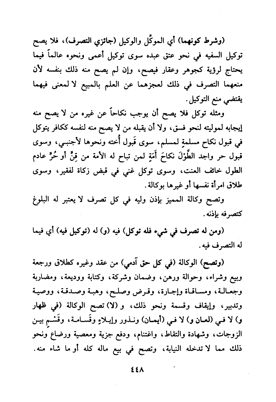 وَشرط كَونهمَا أَي الْمُوكل وَالْوَكِيل جائزي التَّصَرُّف، فَلَا يَصح تَوْكِيل السَّفِيه فِي عتق عَبده سوى تَوْكِيل أعمى وَنَحْوه عَالما فِيمَا يحْتَاج لرؤية كجوهر وعقار فَيصح، وَإِن لم يَصح مِنْهُ ذَلِك بِنَفسِهِ لِأَن منعهما التَّصَرُّف فِي ذَلِك لعجزهما عَن الْعلم بِالْمَبِيعِ لَا لِمَعْنى فيهمَا يَقْتَضِي منع التَّوْكِيل. وَمثله توكل فَلَا يَصح أَن يُوجب نِكَاحا عَن غَيره من لَا يَصح مِنْهُ إِيجَابه لموليته لنَحْو فسق، وَلَا أَن يقبله من لَا يَصح مِنْهُ لنَفسِهِ ككافر يتوكل فِي قبُول نِكَاح مسلمة لمُسلم، سوى قبُول نِكَاح أُخْته وَنَحْوهَا لأَجْنَبِيّ، وَسوى قبُول حر وَاجِد الطول نِكَاح أمة لمن تُبَاح لَهُ الْأمة من قن أَو حر عادم الطول خَائِف الْعَنَت، وَسوى توكل غَنِي فِي قبض زَكَاة لفقير، وَسوى طَلَاق امْرَأَة نَفسهَا أَو غَيرهَا بوكالة. وَتَصِح وكَالَة الْمُمَيز بِإِذن وليه فِي كل تصرف لَا يعْتَبر لَهُ الْبلُوغ كتصرفه بِإِذْنِهِ، وَمن لَهُ تصرف فِي شَيْء فَلهُ توكل فِيهِ وَله تَوْكِيل فِيهِ أَي فِيمَا لَهُ التَّصَرُّف فِيهِ، وَتَصِح الْوكَالَة فِي كل حق آدَمِيّ من عقد وَغَيره كَطَلَاق ورجعة وَبيع وَشِرَاء وحوالة وَرهن وَضَمان وَشركَة وَكِتَابَة ووديعة ومضاربة وجعالة ومساقاة وَإِجَارَة وقرض وَصلح وَهبة وَصدقَة وَوَصِيَّة وتدبير وإيقاف وَقِسْمَة وَنَحْو ذَلِك، وَلَا تصح فِي ظِهَار وَلَا فِي لعان وَلَا فِي أَيْمَان وَنذر وإيلاء وقسامة وَقسم بَين الزَّوْجَات وَشَهَادَة والتقاط واغتنام وَدفع جِزْيَة ومعصية ورضاع وَنَحْو ذَلِك مِمَّا لَا تدخله النِّيَابَة، وَتَصِح فِي بيع مَاله كُله أَو مَا شَاءَ مِنْهُ،