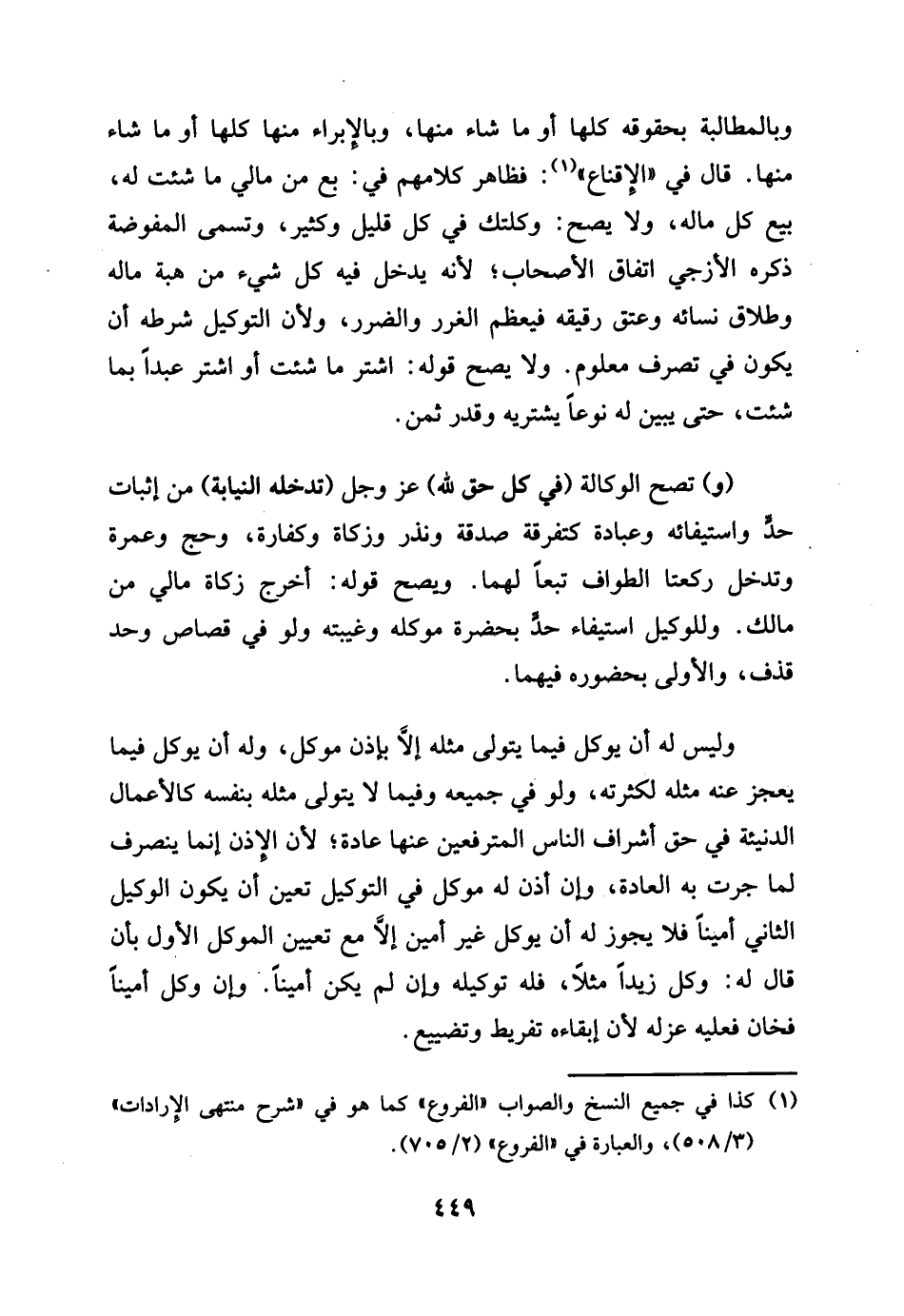 وبالمطالبة بحقوقه كلهَا أَو مَا شَاءَ مِنْهَا، وبالإبراء مِنْهَا كلهَا أَو مَا شَاءَ مِنْهَا. قَالَ فِي الْإِقْنَاع: وَظَاهر كَلَامهم فِي بِعْ، من مَالِي مَا شِئْت، لَهُ بيع كل مَاله. وَلَا يَصح: وَكلتك فِي كل قَلِيل وَكثير وَتسَمى المفوضة ذكر الْأَزجيّ اتِّفَاق الْأَصْحَاب، لِأَنَّهُ يدْخل فِيهِ كل شَيْء من هبة مَاله وَطَلَاق نِسَائِهِ وَعتق رَقِيقه فيعظم الْغرَر وَالضَّرَر، وَلِأَن التَّوْكِيل شَرطه أَن يكون فِي تصرف مَعْلُوم. وَلَا يَصح قَوْله: اشْتَرِ مَا شِئْت أَو اشْتَرِ عبدا بِمَا شِئْت حَتَّى يبين لَهُ نوعا يَشْتَرِيهِ وَقدر ثمن. وَتَصِح الْوكَالَة فِي كل حق الله عز وَجل تدخله النِّيَابَة من إِثْبَات حق واستيفائه وَعبادَة كتفرقة صَدَقَة وَنذر وَكَفَّارَة وَزَكَاة وَحج وَعمرَة، وَتدْخل رَكعَتَا الطّواف تبعا لَهما. وَيصِح: أخرج زَكَاة مَالِي من مَالك. وللوكيل اسْتِيفَاء حد بِحَضْرَة مُوكله وغيبته وَلَو فِي قصاص وحد قذف، وَالْأولَى بِحُضُورِهِ فيهمَا. وَلَيْسَ لَهُ أَن يُوكل فِيمَا يتَوَلَّى مثله إِلَّا بِإِذن مُوكله، وَله أَن يُوكل فِيمَا يعجز عَنهُ مثله لكثرته وَلَو فِي جَمِيعه وَفِيمَا لَا يتَوَلَّى مثله لنَفسِهِ كالأعمال الدنية فِي حق أَشْرَاف النَّاس المترفعين عَنْهَا عَادَة، لِأَن الْإِذْن إِنَّمَا ينْصَرف لما جرت بِهِ الْعَادة، وَإِن أذن لَهُ مُوكل فِي التَّوْكِيل تعين أَن يكون الثَّانِي أَمينا فَلَا يجوز لَهُ أَن يُوكل غير أَمِين إِلَّا مَعَ تعْيين الْمُوكل الأول بِأَن قَالَ لَهُ: وكل زيدا مثلا، فَلهُ تَوْكِيله وَإِن لم يكن أَمينا. وَإِن وكل أَمينا فخان فَعَلَيهِ عَزله لِأَن إبقاءه تَفْرِيط تَضْييع: