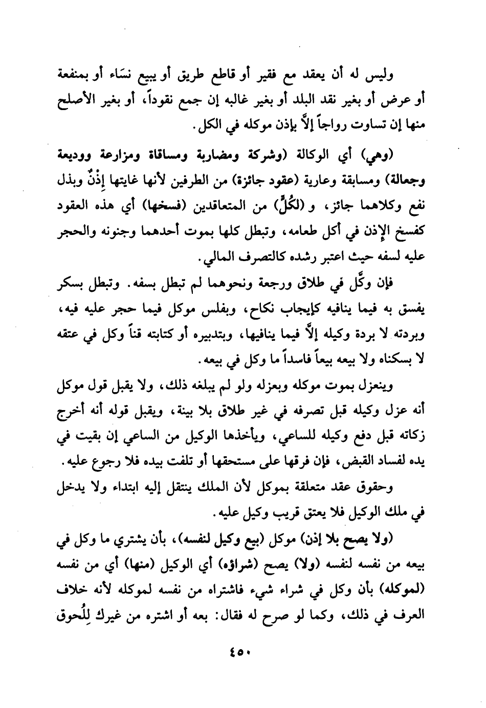 وَلَيْسَ لَهُ أَن يعْقد مَعَ فَقير أَو قَاطع طَرِيق أَو يَبِيع نسَاء أَو بِمَنْفَعَة أَو عرض أَو بِغَيْر نقد الْبَلَد غالبه إِن جمع نقودا. أَو بِغَيْر الْأَصْلَح مِنْهَا إِن تَسَاوَت رواجا إِلَّا بِإِذن مُوكله فِي الْكل. وَهِي أَي الْوكَالَة وَشركَة ومضاربة ومساقاة ومزارعة ووديعة وجعالة ومسابقة وعارية عُقُود جَائِزَة من الطَّرفَيْنِ، لِأَن غايتها إِذن وبذل نفع وَكِلَاهُمَا جَائِز، وَلكُل من الْمُتَعَاقدين فَسخهَا أَي هَذِه الْعُقُود كفسخ الْإِذْن فِي أكل طَعَامه، وَتبطل كلهَا بِمَوْت أَحدهمَا وجنونه وَالْحجر عَلَيْهِ لسفه حَيْثُ اعْتبر رشده كالتصرف المالي. فَإِن وكل فِي طَلَاق ورجعة وَنَحْوهمَا لم تبطل بِسَفَه. وَتبطل بسكر يفسق بِهِ فِيمَا يُنَافِيهِ كإيجاب نِكَاح. وبفلس مُوكل فِيمَا حجر عَلَيْهِ فِيهِ. وبردته لَا بردة وَكيله إِلَّا فِيمَا ينافيها. وبتدبيره أوكتابته قِنَا وكل فِي عتقه لَا بسكناه وَلَا بِبيعِهِ بيعا فَاسِدا مَا وكل فِي بَيْعه. وينعزل بِمَوْت مُوكله وبعزله وَلَو لم يبلغهُ ذَلِك. وَلَا يقبل قَول مُوكل إِنَّه عزل وَكيله قبل تصرفه فِي غير طَلَاق بِلَا بَيِّنَة. وَيقبل قَوْله إِنَّه أخرج زَكَاته قبل دفع وَكيله للساعي، ويأخذها الْوَكِيل من السَّاعِي إِن بقيت فِي يَده لفساد الْقَبْض فَإِن فرقها على مستحقيها، أَو تلفت بِيَدِهِ فَلَا رُجُوع عَلَيْهِ. وَحُقُوق عقد مُتَعَلقَة بموكل لِأَن الْملك ينْتَقل إِلَيْهِ ابْتِدَاء وَلَا يدْخل فِي ملك الْوَكِيل فَلَا يعْتق قريب وَكيل عَلَيْهِ وَلَا يَصح بِلَا إِذن مُوكل بيع وَكيل لنَفسِهِ بِأَن يَشْتَرِي مَا وكل فِي بَيْعه من نَفسه لنَفسِهِ وَلَا يَصح شِرَاؤُهُ أَي الْوَكِيل مِنْهَا أَي من نَفسه لمُوكلِه بِأَن وكل فِي شِرَاء شَيْء فَاشْتَرَاهُ من نَفسه لمُوكلِه لِأَنَّهُ خلاف الْعرق فِي ذَلِك، وكما لَو صرح لَهُ فَقَالَ بِعْهُ أَو اشتره من غَيْرك للحوق