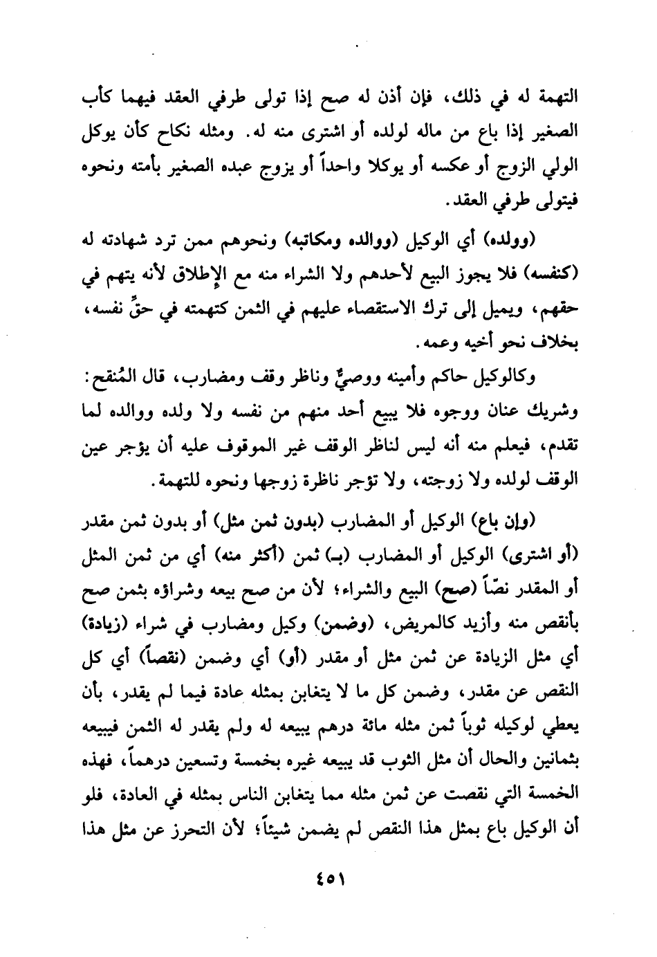 التُّهْمَة لَهُ فِي ذَلِك فَإِن أذن لَهُ صَحَّ إِذا تولى طرفِي العقد فيهمَا، كأب الصَّغِير إِذا بَاعَ من مَاله لوَلَده أَو اشْترى من مَاله لوَلَده. وَمثله نِكَاح كَأَن يُوكل الْوَلِيّ الزَّوْج أَو عَكسه أَو يوكلا وَاحِدًا أَو يُزَوّج عَبده الصَّغِير بأمته وَنَحْوه فيتولى طرفِي العقد. وَولده أَي الْوَكِيل ووالده ومكاتبه وَنَحْوهم مِمَّن ترد شَهَادَته لَهُ كنفسه فَلَا يجوز البيع لأَحَدهم وَلَا الشِّرَاء مِنْهُ مَعَ الْإِطْلَاق، لِأَنَّهُ يتهم فِي حَقهم ويميل إِلَى ترك الِاسْتِقْصَاء عَلَيْهِم فِي الثّمن كتهمته فِي حق نَفسه، بِخِلَاف نَحْو أَخِيه وَعَمه، وكالوكيل حَاكم وأمينه ووصي وناظر وقف ومضارب، قَالَ المنقح: وَشريك عنان ووجوه فَلَا يَبِيع أحد مِنْهُم من نَفسه وَلَا وَلَده ووالده لما تقدم، فَيعلم مِنْهُ أَنه لَيْسَ لناظر الْوَقْف غير الْمَوْقُوف عَلَيْهِ أَن يُؤجر عين الْوَقْف لوَلَده وَلَا وزجته، وَلَا تؤجر ناظرة زَوجهَا وَنَحْوه للتُّهمَةِ وَإِن بَاعَ الْوَكِيل أَو الْمضَارب بِدُونِ ثمن مثل أَو بِدُونِ ثمن مُقَدّر أَو اشْترى الْوَكِيل أَو الْمضَارب ب ثمن أَكثر مِنْهُ أَي من ثمن الْمثل أَو الْمُقدر نصا صَحَّ البيع وَالشِّرَاء لِأَن من صَحَّ بَيْعه وشراؤه بِثمن صَحَّ بأنقص مِنْهُ وأزيد كَالْمَرِيضِ وَضمن وَكيل ومضارب فِي شِرَاء زِيَادَة أَي مثل الزِّيَادَة عَن ثمن مثل أَو مُقَدّر أَو أَي وَضمن نقصا أَي كل النَّقْص عَن مُقَدّر وَضمن كل مَالا يتَغَابَن بِمثلِهِ عَادَة فِيمَا لم يقدر، بِأَن يُعْطي لوَكِيله ثوبا ثمن مثله مائَة دِرْهَم، يَبِيعهُ لَهُ وَلم يقدر لَهُ الثّمن فيبيعه بِثَمَانِينَ وَالْحَال أَن مثل الثَّوْب وَقد يَبِيعهُ غَيره بِخَمْسَة وَثَمَانِينَ درهما، فَهَذِهِ الْخَمْسَة الَّتِي نقصت عَن ثمن مثله مِمَّا يتَغَابَن النَّاس بِمثلِهِ فِي الْعَادة فَلَو أَو الْوَكِيل بَاعَ بِمثل هَذَا النَّقْص لم يضمن لِأَن التَّحَرُّز عَن مثل هَذَا