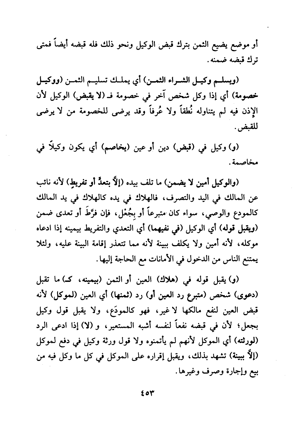 أَو مَوضِع يضيع الثّمن بترك قبض أَو نَحْو ذَلِك فَلهُ قَبضه أَيْضا فَمَتَى ترك قَبضه ضمنه، وَسلم وَكيل الشِّرَاء الثّمن أَي يملك تَسْلِيم الثّمن ووكيل خُصُومَة أَي إِذا وكل شخص آخر فِي خُصُومَة ف لَا يقبض الْوَكِيل لِأَن الْإِذْن فِيهِ لم يتَنَاوَلهُ نطقا وَلَا عرفا وَقد يرضى للخصومة من لَا يرضى للقبض ووكيل فِي قبض دين أَو عين يُخَاصم أَي يكون وَكيلا فِي مخاصمة وَالْوَكِيل أَمِين لَا يضمن مَا تلف بِيَدِهِ إِلَّا بتعد أَو تَفْرِيط لِأَنَّهُ نَائِب عَن الْمَالِك فِي الْيَد وَالتَّصَرُّف، فالهلاك فِي يَده كالهلاك فِي يَد الْمَالِك كَالْمُودعِ وَالْوَصِيّ، وَسَوَاء كَانَ مُتَبَرعا أَو بِجعْل فَإِن فرط أَو تعدى ضمن وَيقبل قَوْله أَي الْوَكِيل فِي نفيهما أَي التَّعَدِّي والتفريط بِيَمِينِهِ إِذا ادَّعَاهُ مُوكله، لِأَنَّهُ أَمِين وَلَا يُكَلف بِبَيِّنَة لِأَنَّهُ مِمَّا تتعذر إِقَامَة الْبَيِّنَة عَلَيْهِ، وَلِئَلَّا يمْتَنع النَّاس من الدُّخُول فِي الْأَمَانَات مَعَ الْحَاجة إِلَيْهَا، وَيقبل قَوْله فِي هَلَاك الْعين أَو الثّمن بِيَمِينِهِ، ك مَا تقبل دَعْوَى شخص مُتَبَرّع رد الْعين أَو رد ثمنهَا أَي الْعين لموكل لِأَنَّهُ قبض الْعين لنفع مَالِكهَا لَا غير، فَهُوَ كَالْمُودعِ، وَلَا يقبل قَول وَكيل يَجْعَل، لِأَن فِي قَبضه نفعا لنَفسِهِ أشبه الْمُسْتَعِير وَلَا إِذا ادّعى الرَّد لوَرثَته أَي الْمُوكل لأَنهم لم يأتمنوه وَلَا قَول وَرَثَة وَكيل فِي دفع لموكل إِلَّا بِبَيِّنَة تشهد بذلك. وَيقبل إِقْرَاره على الْمُوكل فِي كل مَا وكل فِيهِ من بيع وَإِجَارَة وَصرف وَغَيرهَا.