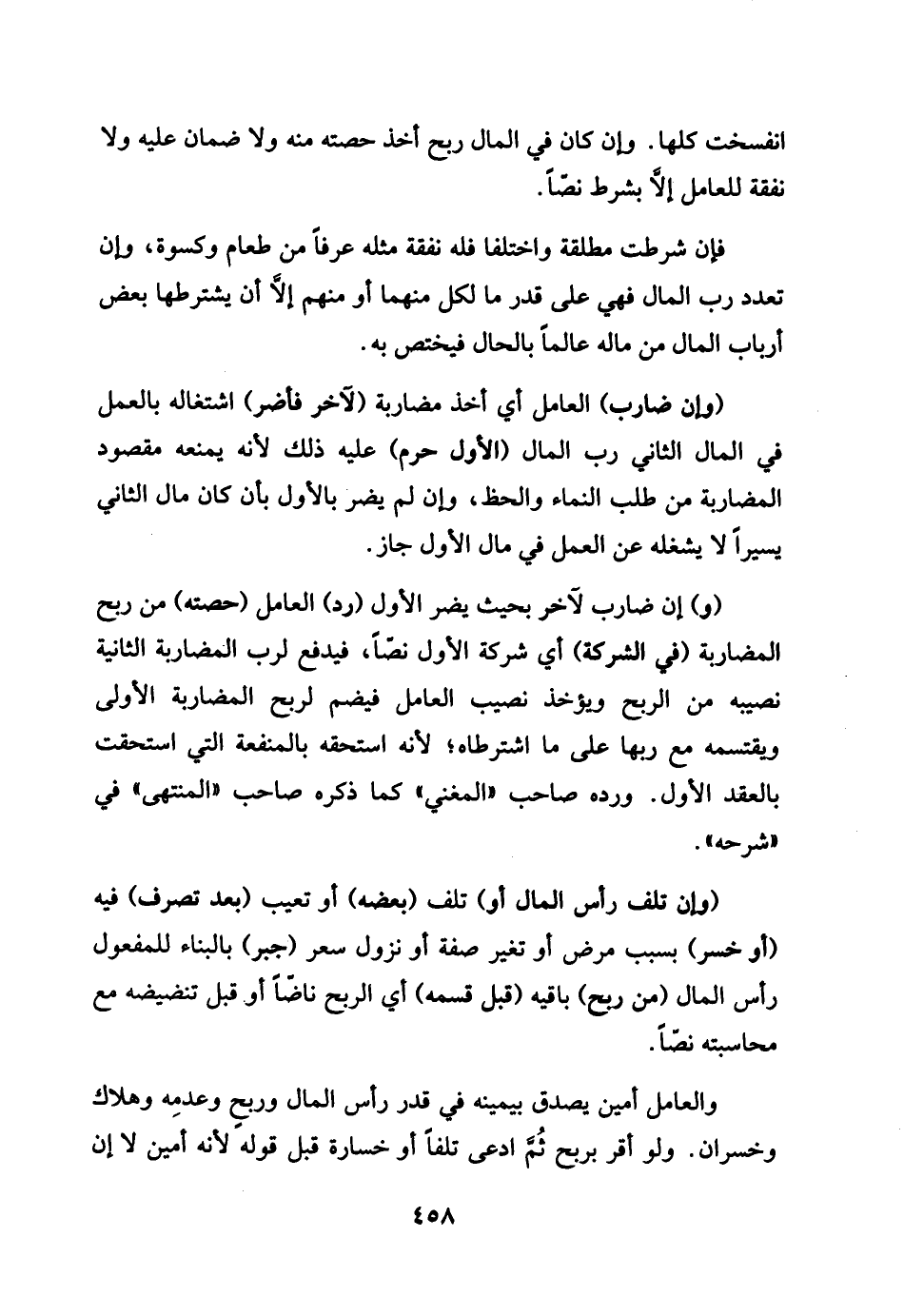 انْفَسَخت كلهَا. وَإِن كَانَ فِي المَال ربح أَخذ حِصَّته مِنْهُ وَلَا ضَمَان عَلَيْهِ وَلَا نَفَقَة لِلْعَامِلِ إِلَّا بِشَرْط نصا. فَإِن شرطت مُطلقَة وَاخْتلفَا فَلهُ نَفَقَة مثله عرفا من طَعَام وَكِسْوَة، وَإِن تعدد رب المَال فَهِيَ على قدر مَا لكل مِنْهُمَا أَو مِنْهُم إِلَّا أَن يشترطها بعض أَرْبَاب المَال من مَاله عَالما بِالْحَال فتختص بِهِ. وَإِن ضَارب الْعَامِل أَي أَخذ مُضَارَبَة لآخر فأضر اشْتِغَاله بِالْعَمَلِ فِي المَال الثَّانِي رب المَال الأول حرم عَلَيْهِ ذَلِك، لِأَنَّهُ يمنعهُ مَقْصُود الْمُضَاربَة من طلب النَّمَاء والحظ، وَإِن لم يضر بِالْأولِ بِأَن كَانَ مَال الثَّانِي يَسِيرا لَا يشغل عَن الْعَمَل فِي مَال الأول جَازَ. وَإِن ضَارب الآخر بِحَيْثُ يضر الأول رد الْعَامِل حِصَّته من الْمُضَاربَة فِي الشّركَة أَو شركَة الأول نصا فَيدْفَع لرب الْمُضَاربَة الثَّانِيَة نصِيبه من الرِّبْح وَيَأْخُذ نصيب الْعَامِل فيضم لربح الْمُضَاربَة الأولى ويقتسمه مَعَ رَبهَا على مَا شرطاه لِأَنَّهُ اسْتَحَقَّه بِالْمَنْفَعَةِ الَّتِي اسْتحقَّت العقد الأول. ورده صَاحب الْمُغنِي كَمَا ذكره صَاحب الْمُنْتَهى فِي شَرحه وَإِن تلف رَأس المَال أَو تلف بعضه أَو تعيب بعد تصرف فِيهِ أَو خسر بِسَبَب مرض أَو تغير صفة أَو نزُول سعر جبر بِالْبِنَاءِ للْمَفْعُول رَأس المَال من ربح بَاقِيه قبل قسْمَة أَي الرِّبْح ناضا أَو قبل تنضيضه مَعَ محاسبته نصا. وَالْعَامِل أَمِين فَيصدق بِيَمِينِهِ فِي قدر رَأس المَال وَربح وَعَدَمه وهلاك وخسران. وَلَو أقرّ بِرِبْح ثمَّ ادّعى تلفا أَو خسارة قبل قَوْله لِأَنَّهُ أَمِين إِلَّا إِن