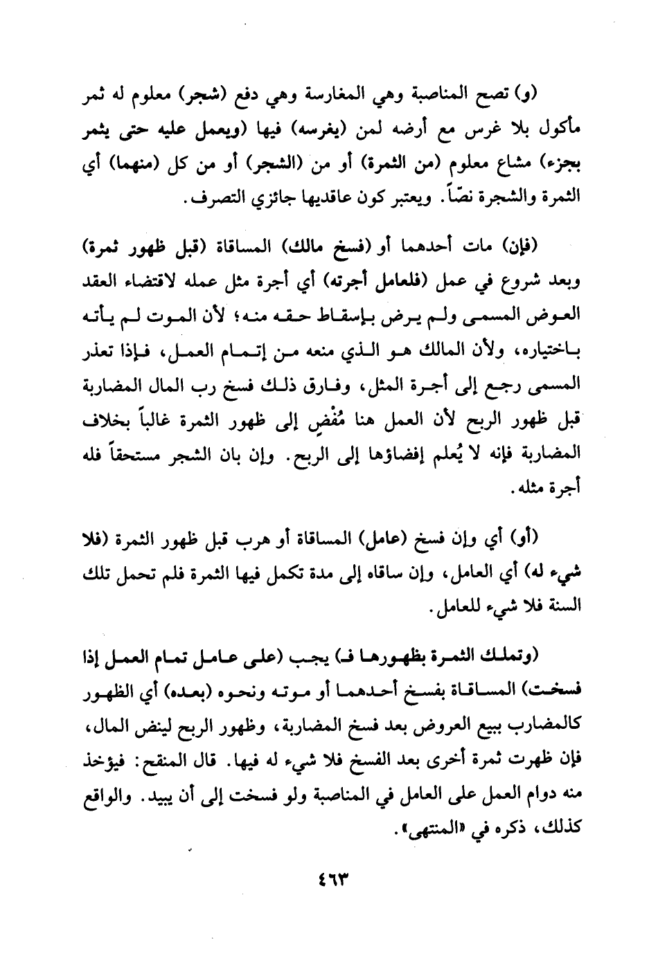 وَتَصِح المناصبة وَهِي المغارسة وَهِي دفع شجر مَعْلُوم لَهُ ثَمَر مَأْكُول بِلَا غرس مَعَ أرضه لمن يغرسه فِيهَا وَيعْمل عَلَيْهِ حَتَّى يُثمر بِجُزْء مشَاع مَعْلُوم من الثَّمَرَة أَو من الشّجر أَو من كل مِنْهُمَا أَي الثَّمَرَة وَالشَّجر نصا. وَيعْتَبر كَون عاقديها جائزي التَّصَرُّف فَإِن مَاتَ أَحدهمَا أَو فسخ مَالك الْمُسَاقَاة قبل ظُهُور ثَمَرَة وَبعد شُرُوع فِي عمل فلعامل أجرته أَي أُجْرَة مثل عمله لاقْتِضَاء العقد الْعِوَض الْمُسَمّى، وَلم يرض بِإِسْقَاط حَقه مِنْهُ لِأَن الْمَوْت لم يَأْته بِاخْتِيَارِهِ، وَلِأَن الْمَالِك هُوَ الَّذِي مَنعه من إتْمَام الْعَمَل، فَإِذا تعذر الْمُسَمّى رَجَعَ إِلَى أُجْرَة الْمثل، وَفَارق ذَلِك فسخ رب المَال الْمُضَاربَة قبل ظُهُور الرِّبْح، لِأَن الْعَمَل هَهُنَا منفض إِلَى ظُهُور الثَّمَرَة غَالِبا بِخِلَاف الْمُضَاربَة فَإِنَّهُ لَا يعلم إفضاؤها إِلَى الرِّبْح. وَإِن بَان الشّجر مُسْتَحقّا فَلهُ أُجْرَة مثله أَو أَي وَإِن فسخ عَامل الْمُسَاقَاة أَو هرب قبل ظُهُور الثَّمَرَة فَلَا شَيْء لَهُ أَي الْعَامِل، وَإِن ساقاه إِلَى مُدَّة تكمل فِيهَا الثَّمَرَة فَلم تحمل تِلْكَ السّنة فَلَا شَيْء لِلْعَامِلِ. وتملك الثَّمَرَة بظهورها فَيجب على عَامل تَمام الْعَمَل إِذا فسخت الْمُسَاقَاة بِفَسْخ أَحدهمَا أَو مَوته وَنَحْوه بعد أَي الظُّهُور، كالمضارب بِبيع الْعرُوض بعد فسخ الْمُضَاربَة وَظُهُور الرِّبْح لينض المَال، فَإِن ظَهرت ثَمَرَة بعد الْفَسْخ فَلَا شَيْء لَهُ فِيهَا. قَالَ المنقح: فَيُؤْخَذ مِنْهُ دوَام الْعَمَل على الْعَامِل فِي المناصبة وَلَو فسخت إِلَى أَن تبيد. وَالْوَاقِع كَذَلِك. ذكره فِي الْمُنْتَهى.