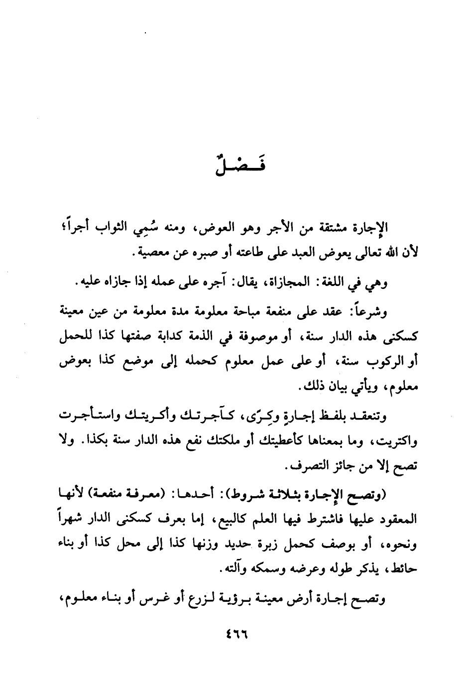 فصل. الْإِجَارَة مُشْتَقَّة من الْأجر وَهُوَ الْعِوَض، وَمِنْه سمى الثَّوَاب أجرا لِأَن الله تَعَالَى يعوض العَبْد على طَاعَته أَو صبره عَن مَعْصِيَته. وَهِي فِي اللُّغَة المجازاة يُقَال: آجره على عمله إِذا جازاه عَلَيْهِ. وَشرعا عقد على مَنْفَعَة مُبَاحَة مَعْلُومَة مُدَّة مَعْلُومَة من عين مُعينَة كسكني هَذِه الدَّار سنة، أَو مَوْصُوفَة فِي الذِّمَّة كدابة صفتهَا كَذَا للْحَمْل أَو الرّكُوب سنة، أَو على عمل مَعْلُوم كحمله إِلَى مَوضِع كَذَا بعوض مَعْلُوم، وَيَأْتِي بَيَان ذَلِك. وتنعقد بِلَفْظ إِجَارَة وكرى كآجرتك وأكريتك وستأجرت واكتريت، وَمَا بمعناهما كأعطيتك أَو مَلكتك نفع هَذِه الدَّار سنة بِكَذَا. وَلَا تصح إِلَّا من جَائِز التَّصَرُّف. وَتَصِح الْإِجَارَة بِثَلَاثَة شُرُوط: أَحدهَا معرفَة مَنْفَعَة لِأَنَّهَا الْمَعْقُود عيها، فَاشْترط فِيهَا الْعلم كَالْبيع إِمَّا بعرف كسكني الدَّار شهرا وَنَحْوه، وَإِمَّا بِوَصْف كحمل زبرة حَدِيد وَزنهَا كَذَا إِلَى مَحل كَذَا وَبِنَاء حَائِط يذكر طوله وَعرضه وسمكه وآلته. وَتَصِح إِجَارَة أَرض مُعينَة بِرُؤْيَة لزرع أَو غرس أَو بِنَاء مَعْلُوم،