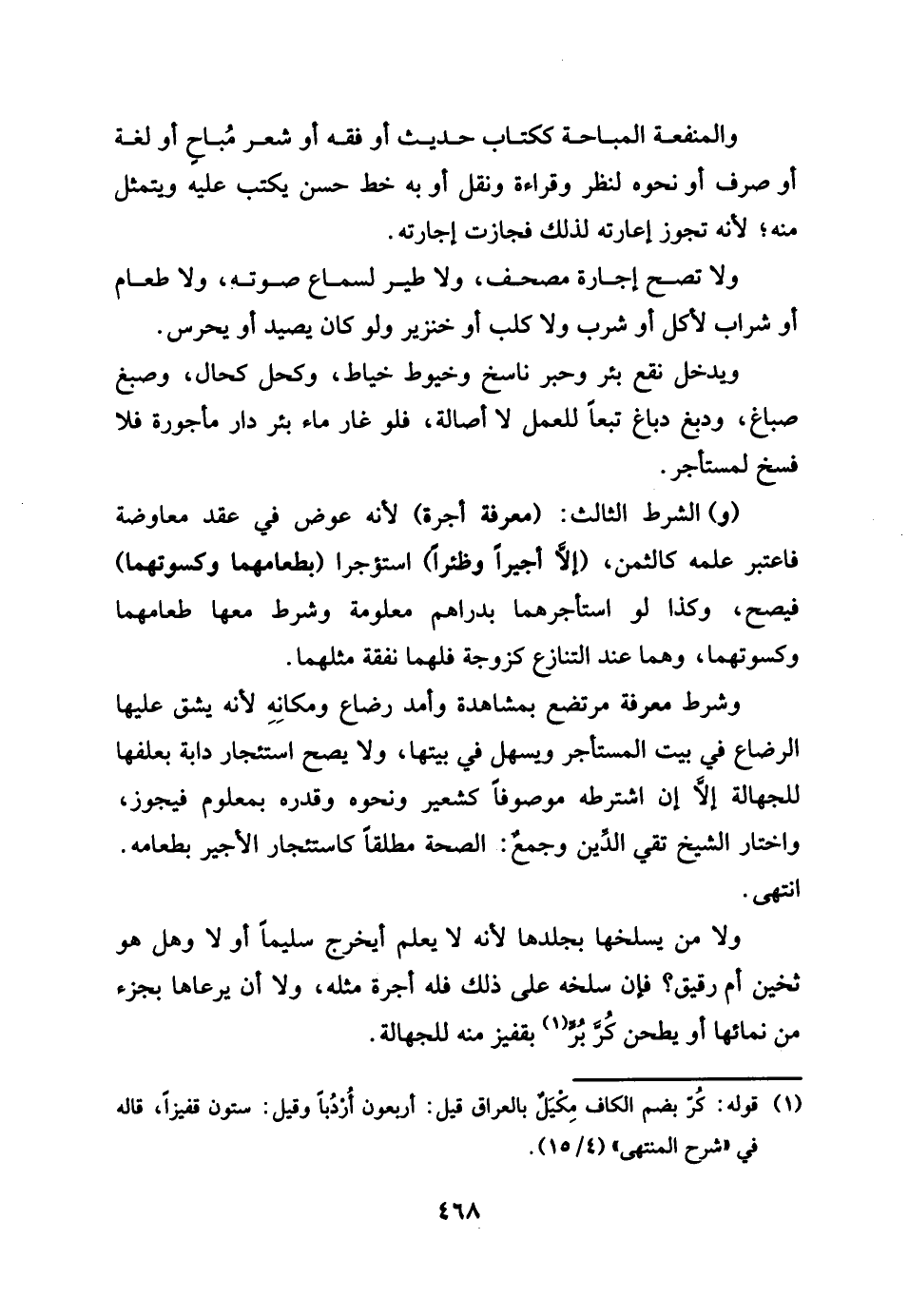 وَالْمَنْفَعَة الْمُبَاحَة ككتاب حَدِيث أَو فقه أَو شعر مُبَاح أَو لُغَة أَو صرف أَو نَحْو ذَلِك لنظر وَقِرَاءَة وَنقل أَو بِهِ خطّ حسن يكْتب عَلَيْهِ ويتمثل مِنْهُ لِأَنَّهُ تجوز إعارته لذَلِك فجازت إِجَارَته. وَلَا تصح إِجَارَة مصحف وَلَا طير لسَمَاع صَوته وَلَا طَعَام أَو شراب لأكل أَو شرب وَلَا كلب أَو خِنْزِير وَلَو كَانَ يصيد أَو يحرس. وَيدخل نقع بِئْر وَحبر نَاسخ وخيط خياط وكحل كَحال وصبغ صباغ ودبغ دباغ تبعا للْعَمَل لَا أَصَالَة، فَلَو غَار مَاء بِئْر دَار مأجورة فَلَا فسخ لمستأجر. وَالشّرط الثَّالِث معرفَة أُجْرَة لِأَنَّهُ عوض فِي عقد مُعَاوضَة فَاعْتبر علمه كَالثّمنِ، إِلَّا أَجِيرا وظئرا استؤجرا بطعامهما وكسوتهما فَيصح، وَكَذَا لَو استأجرهما بِدَرَاهِم مَعْلُومَة وَشرط مَعهَا طعامهما وكسوتهما، وهما عِنْد التَّنَازُع كَزَوْجَة فَلَهُمَا نَفَقَة مثلهمَا، وَشرط معرفَة مرتضع بمشاهدة وأمد رضَاع ومكانه، لِأَنَّهُ يشق عَلَيْهَا الرَّضَاع فِي بَيت الْمُسْتَأْجر ويسهل فِي بَيتهَا، لَا يَصح اسْتِئْجَار دَابَّة بعلفها للْجَهَالَة إِلَّا إِن اشْتَرَطَهُ مَوْصُوفا كشعير وَنَحْوه، وَقدره بِمَعْلُوم فَيجوز. وَاخْتَارَ الشَّيْخ تَقِيّ الدّين وَجمع الصِّحَّة مُطلقًا كاستئجار الْأَجِير بطعامه. انْتهى. وَلَا من يسلخها لِأَنَّهُ لَا يعلم أيخرج سليما أَو لَا وَهل ثخين أَو رَقِيق، فَإِن سلخه على ذَلِك فَلهُ أُجْرَة مثله، وَلَا أَن يرعاها بِجُزْء من نمائها أَو يطحن كربر بقفيز مِنْهُ للْجَهَالَة