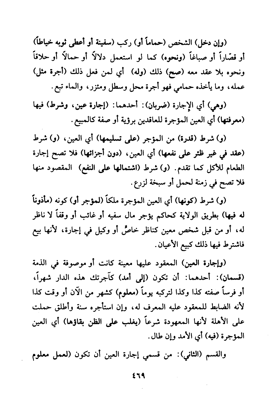 وَإِن دخل الشَّخْص حَماما أَو ركب سفينة أَو أعْطى ثَوْبه خياطا أَو قصارا أَو صباغا وَنَحْوه كَمَا لَو اسْتعْمل دلالا أَو حمالا أَو حلاقا بِلَا عقد مَعَه صَحَّ ذَلِك وَله أَي لمن فعل ذَلِك أُجْرَة مثل عمله، وَمَا يَأْخُذهُ حمامي فَهُوَ أُجْرَة مَحل وسطل ومئزر، وَالْمَاء تبع. وَهِي أَي الْإِجَارَة ضَرْبَان: أَحدهمَا إِجَارَة عين، وَشرط فِيهَا مَعْرفَتهَا أَي الْعين الْمُؤجرَة للعاقدين بِرُؤْيَة أَو صفة، وَشرط قدرَة من الْمُؤَجّر على تَسْلِيمهَا أَي الْعين، وَشرط عقد فِي غير ظئر على نَفعهَا أَي الْعين دون أَجْزَائِهَا وَلَا تصح إِجَارَة الطَّعَام للْأَكْل كَمَا تقدم، وَشرط اشتمالها على النَّفْع الْمَقْصُود مِنْهَا فَلَا تصح فِي زمنة لحمل أَو سبخَة لزرع. وَشرط كَونهَا أَي الْعين الْمُؤجرَة ملكا لمؤجر أَو كَونه ماذونا لَهُ فِيهَا بطرِيق الْولَايَة كحاكم يُؤجر مَال سَفِيه أَو غَائِب أَو وَقفا لَا نَاظر لَهُ، أَو من قبل شخص معِين كناظر خَاص أَو وَكيل فِي إِجَارَة، لِأَنَّهَا بيع فَاشْترط فِيهَا ذَلِك كَبيع الْأَعْيَان وَإِجَارَة الْعين الْمَعْقُود عَلَيْهَا مُعينَة كَانَت أَو مَوْصُوفَة فِي الذِّمَّة قِسْمَانِ: أَحدهمَا أَن تكون إِلَى أمد كآجرتك هَذِه الدَّار شهرا، أَو فرسا صفته كَذَا وَكَذَا لتركبه يَوْمًا. مَعْلُوم كشهر من الْآن أَو وَقت كَذَا لِأَنَّهُ الضابطة للمعقود عَلَيْهِ الْمُعَرّف لَهُ، وَإِن اسْتَأْجرهُ سنة وَأطلق حملت على الْأَهِلّة، لِأَنَّهَا الْمَعْهُودَة شرعا يغلب على الظَّن بَقَاؤُهَا أَي الْعين الْمُؤجرَة فِيهِ أَي الأمد وَإِن طَال. وَالْقسم الثَّانِي من قسمي إِجَارَة الْعين أَن تكون لعمل مَعْلُوم