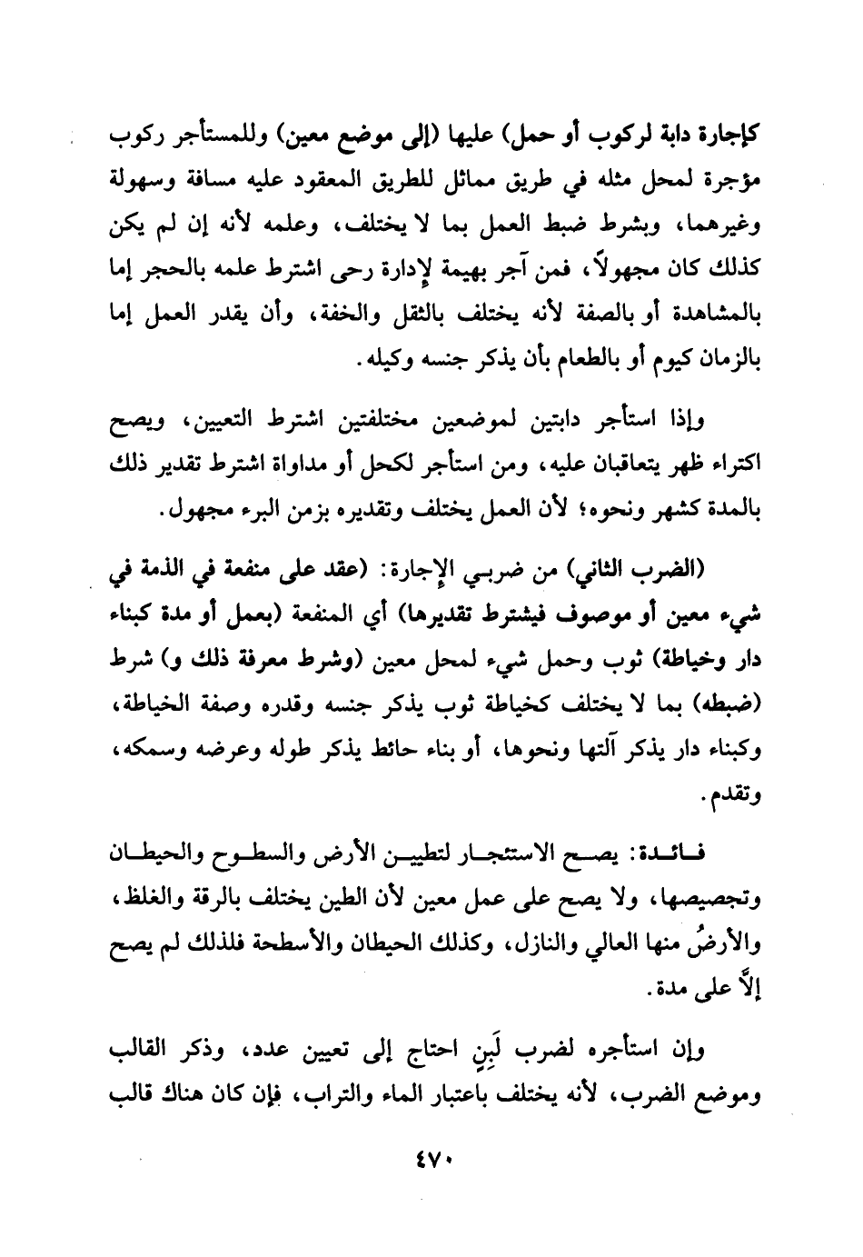 كإجارة دَابَّة لركوب أَو حمل عَلَيْهَا إِلَى مَوضِع معِين وللمستأجر ركُوب مؤجرة لمحل مثله فِي طَرِيق مماثل للطريق الْمَعْقُود عَلَيْهِ مَسَافَة وسهولة وَغَيرهمَا، وبشرط ضبط الْعَمَل بِمَا لَا يخْتَلف، وَعلمه لِأَنَّهُ إِن لم يكن كَذَلِك كَانَ مَجْهُولا، فَمن آجر بَهِيمَة لإدارة رحى اشْترط علمه بِالْحجرِ إِمَّا بِالْمُشَاهَدَةِ أَو بِالصّفةِ لِأَنَّهُ يخْتَلف بالثقل والخفة، وَأَن يقدر الْعَمَل إِمَّا بِالزَّمَانِ كَيَوْم أَو بِالطَّعَامِ بِأَن يذكر جنسه وَكيله. وَإِذا اسْتَأْجر دابتين لموضعين مُخْتَلفين اشْترط التَّعْيِين، وَيصِح اكتراء ظهر يتعاقبان عَلَيْهِ، وَمن اسْتَأْجر لكحل أَو مداواة اشْترط تَقْدِير ذَلِك بالمدة كشهر وَنَحْوه، لِأَن الْعَمَل يخْتَلف وَتَقْدِيره بِزَمن الْبُرْء مَجْهُول. الضَّرْب الثَّانِي من ضربي الْإِجَارَة عقد على مَنْفَعَة فِي الذِّمَّة فِي شَيْء معِين أَو مَوْصُوف فَيشْتَرط تقديرها أَي الْمَنْفَعَة بِعَمَل أَو مُدَّة كبناء دَار وخياطة ثوب وَحمل شَيْء لمحل معِين وَشرط معرفَة ذَلِك وَشرط ضَبطه بِمَا لَا يخْتَلف، كخياطة ثوب