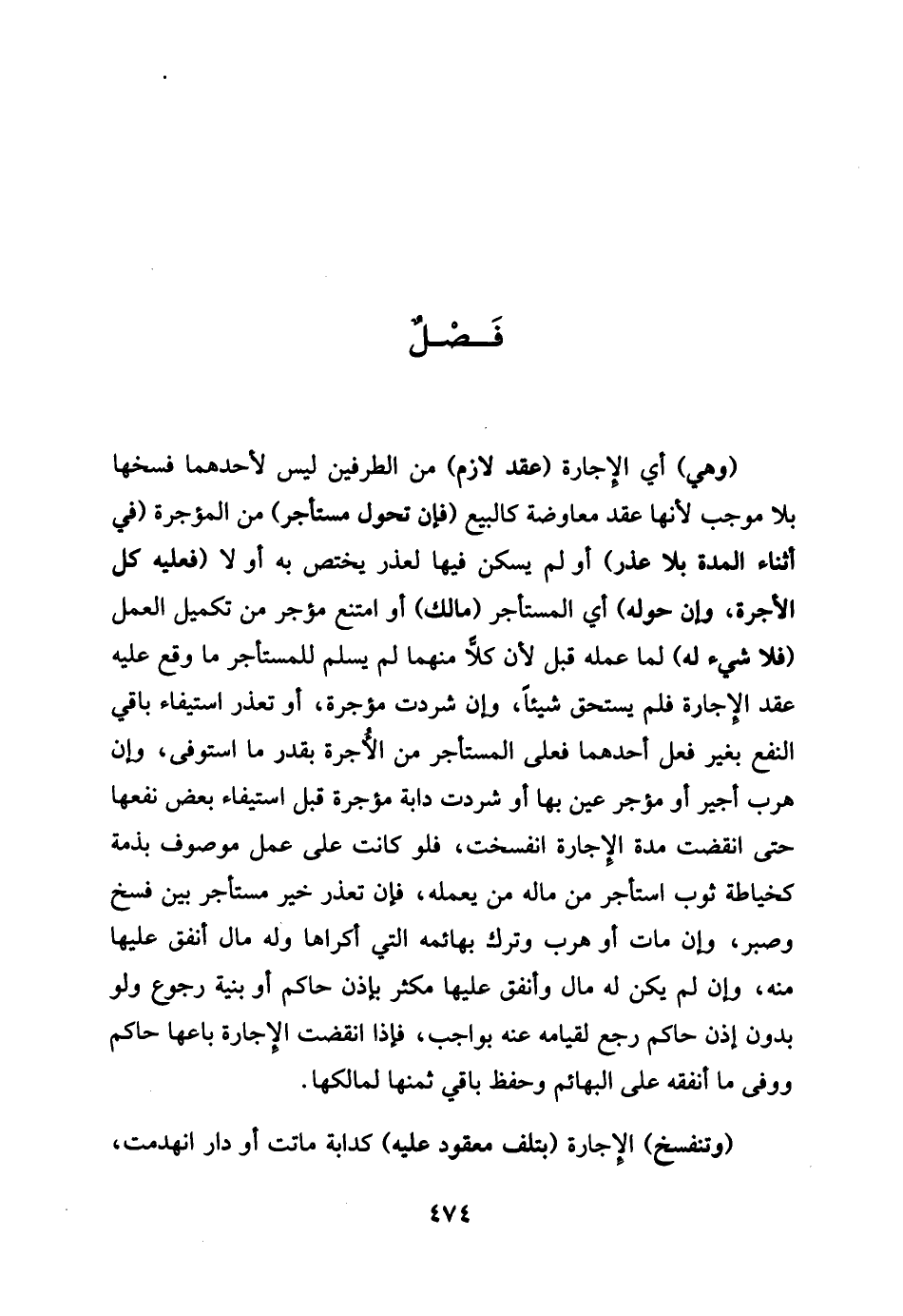 . وَهِي الْإِجَارَة عقد لَازم من الطَّرفَيْنِ لَيْسَ لأَحَدهمَا فَسخهَا بِلَا مُوجب لِأَنَّهَا عقد مُعَاوضَة كَالْبيع فَإِن تحول مُسْتَأْجر من الْمُؤَجّر فِي أثْنَاء الْمدَّة بِلَا عذر أَو لم يكن فِيهَا لعذر يخْتَص بِهِ أَو لَا فَعَلَيهِ كل الْأُجْرَة، وَإِن حوله الْمُسْتَأْجر مَالك أَو امْتنع الْأَجِير من تَكْمِيل الْعَمَل فَلَا شَيْء لَهُ لما عمله قبل، لِأَن كلا مِنْهُمَا لم يسلم إِلَى الْمُسْتَأْجر مَا وَقع عَلَيْهِ عقد الْإِجَارَة فَلم يسْتَحق شَيْئا، وَإِن شَردت مؤجرة أَو تعذر اسْتِيفَاء بَاقِي النَّفْع بِغَيْر فعل أَحدهمَا فعلى الْمُسْتَأْجر من الْأُجْرَة بِقدر مَا استوفى، وَإِن هرب أجِير ومؤجر عين بهَا أَو شَردت دَابَّة مؤجرة قبل اسْتِيفَاء بعض نَفعهَا حَتَّى انْقَضتْ مُدَّة الْإِجَارَة انْفَسَخت، فَلَو كَانَت على مَوْصُوف بِذِمَّة كخياطة ثوب اسْتَأْجر من مَاله من يُعلمهُ فَإِن تعذر خير مُسْتَأْجر بَين فسخ وصبر، وَإِن مَاتَ أَو هرب وَترك بهائمه الَّتِي أكراها وَله مَال أنْفق عَلَيْهَا مِنْهُ حَاكم، وَإِن لم يكن لَهُ مَال وَأنْفق مؤجر بِإِذن حَاكم أَو نِيَّة رُجُوع وَلَو بِدُونِ إِذن حَاكم رَجَعَ لقِيَامه عَنهُ بِوَاجِب، فَإِذا انْقَضتْ الْإِجَارَة بَاعهَا حَاكم ووفى مَا أنفقهُ على الْبَهَائِم وَحفظ بَاقِي ثمنهَا لمَالِكهَا. وتنفسخ الْإِجَارَة بِتَلف مَعْقُود عَلَيْهِ كدابة مَاتَت أَو دَار انْهَدَمت،