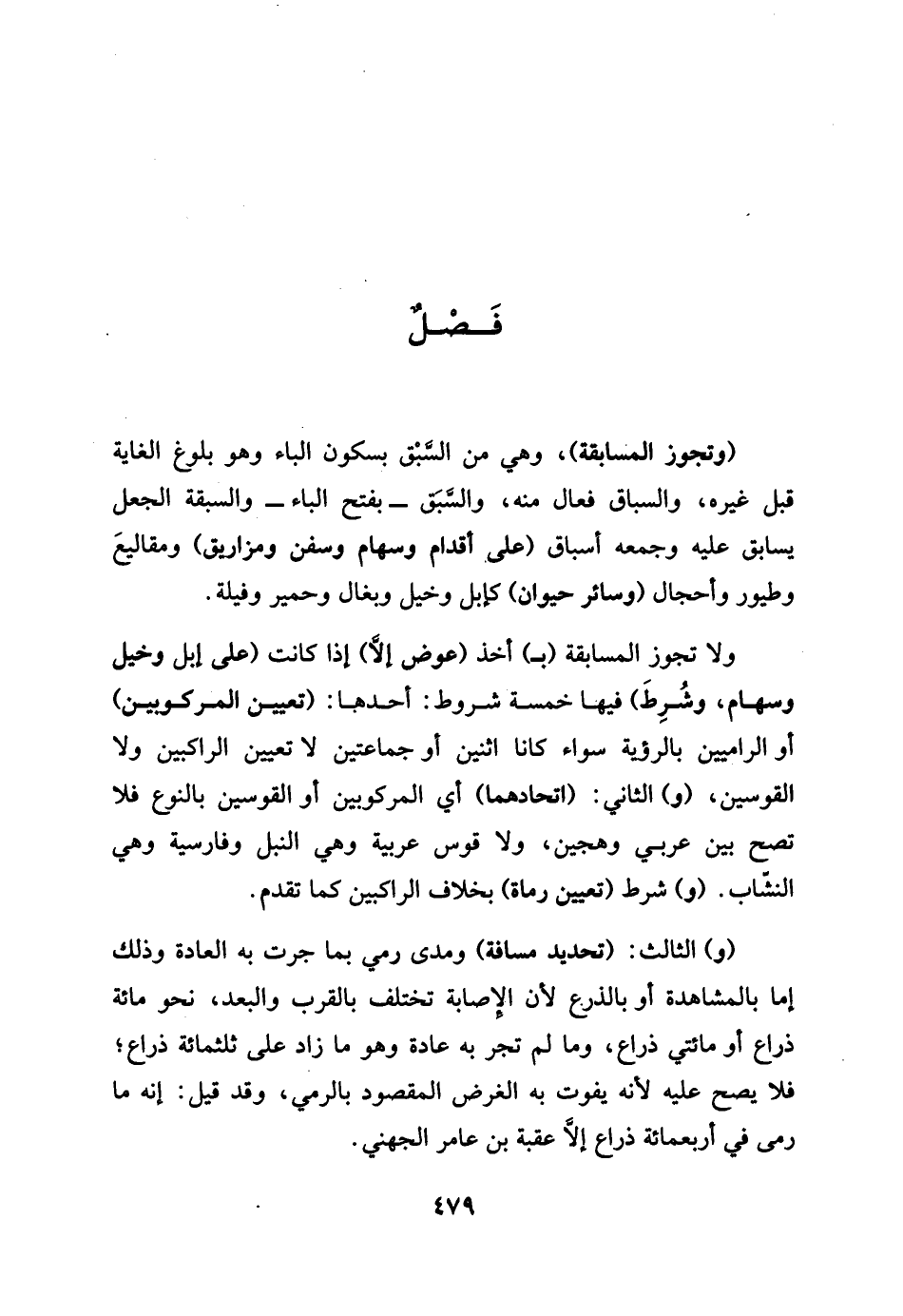 وَتجوز الْمُسَابقَة وَهِي من السَّبق بِسُكُون الْبَاء وَهُوَ بُلُوغ الْغَايَة قبل غَيره، والسباق فعال مِنْهُ والسبق بِفَتْح الْبَاء والسبقة الْجعل يسابق عَلَيْهِ وَجمعه أسباق على أَقْدَام وسهام وسفن ومزاريق ومقاليع وطيور وأحجار وَسَائِر حَيَوَان كإبل وخيل وبغال وحمير وفيله. و [لَا] تجوز الْمُسَابقَة بعوض [إِلَّا] إِذا كَانَت على [إبل وخيل وسهام وَشرط] فِيهَا خَمْسَة شُرُوط: أَحدهَا تعْيين المركوبين أَو الراميين بِالرُّؤْيَةِ سَوَاء كَانَا اثْنَيْنِ أَو جماعتين لَا تعْيين الراكبين وَلَا القوسين، وَالثَّانِي اتحادهما أَي المركوبين أَو القوسين بالنوع فَلَا يَصح بَين عَرَبِيّ وهجين، وَلَا قَوس عَرَبِيَّة وَهِي النبل وفارسية وَهِي النشاب وَشرط تعْيين رُمَاة بِخِلَاف الراكبين كَمَا تقدم، وَالثَّالِث تَحْدِيد مَسَافَة ومدى رمى بِمَا جرت بِهِ الْعَادة، وَذَلِكَ إِمَّا بالمشاهد أَو بالذرع لِأَن الْإِصَابَة تخْتَلف بِالْقربِ والبعد، نَحْو مائَة ذِرَاع أَو مِائَتي ذِرَاع، وَمَا لم تجر بِهِ عَادَة وَهُوَ مَا زادعلى ثلثمِائة ذِرَاع فَلَا يَصح عَلَيْهِ لِأَنَّهُ يفوت بِهِ الْغَرَض الْمَقْصُود بِالرَّمْي، وَقد قيل إِنَّه مَا رمى فِي أَرْبَعمِائَة ذِرَاع إِلَّا عقبَة بن عَامر الْجُهَنِيّ،