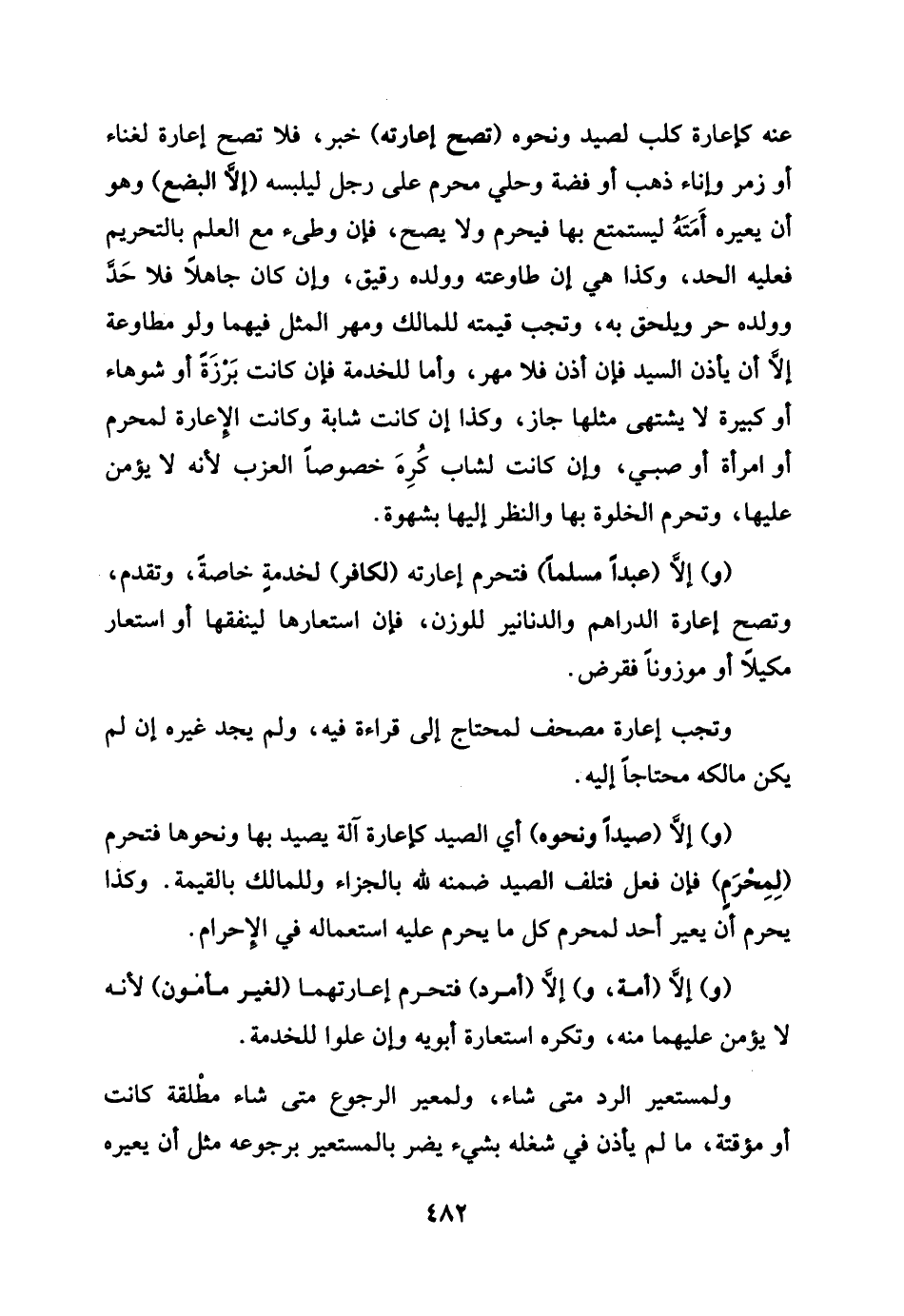 عَنهُ كإعارة كلب لصيد وَنَحْوه تصح إعارته خبر، فَلَا تصح إِعَارَة لغناء أَو زمر وإناء ذهب أَو فضَّة وحلي محرم على رجل ليلبسه الا الْبضْع وَهُوَ أَن يعيره أمته ليستمتع بهَا فَيحرم وَلَا يَصح، فَإِنَّهُ وطىء مَعَ الْعلم بِالتَّحْرِيمِ فَعَلَيهِ الْحَد، وَكَذَا هِيَ إِن طاوعته وَولده رَقِيق، وَإِن كَانَ جَاهِلا فَلَا حد وَلَده حر وَيلْحق بِهِ، وَتجب قِيمَته للْمَالِك وَمهر الْمثل فيهمَا وَلَو مطاوعة إِلَّا أَن يَأْذَن السَّيِّد فَإِن أذن فَلَا مهر. وَأما للْخدمَة فَإِن كَانَت بَرزَة أَو شوهاء أَو كَبِيرَة لَا يَشْتَهِي مثلهَا جَازَ، وَكَذَا إِن كَانَت شَابة وَكَانَت الاعارة لمحرم أَو امْرَأَة أَو صبي، وَإِن كَانَت لشاب كره خُصُوصا العزب لِأَنَّهُ لَا يُؤمن عَلَيْهَا. وَتحرم الْخلْوَة بهَا وَالنَّظَر إِلَيْهَا بِشَهْوَة وَإِلَّا عبدا مُسلما فَتحرم إعارته لكَافِر لخدمة خَاصَّة، وَتقدم وَتَصِح إِعَارَة الدَّرَاهِم وَالدَّنَانِير للوزن فَإِن استعارها لينفقها أَو استعارها مَكِيلًا أَو مَوْزُونا فقرض. وَتجب إِعَارَة مصحف لمحتاج الى قِرَاءَة فِيهِ وَلم يجد غَيره وَإِن لم يكن مَالِكه مُحْتَاجا اليه وَإِلَّا صيدا وَنَحْوه أى الصَّيْد كإعارة آلَة يصيد بهَا وَنَحْوهَا فَتحرم لمحرم فَإِن فعل فَتلف الصَّيْد ضمنه لله بالجزاء وللمالك بِالْقيمَةِ. وَكَذَا يحرم أَن يعير أحد لمحرم كل مَا يحرم عَلَيْهِ اسْتِعْمَاله فِي الاحرام، وَإِلَّا أمة، وَإِلَّا أَمْرَد فَتحرم إعارتهما لغير مَأْمُون لِأَنَّهُ لَا يُؤمن عَلَيْهِمَا مِنْهُ. وَتكره اسْتِعَارَة أَبَوَيْهِ وَإِن علوا للْخدمَة. ولمستعير الرَّد مَتى شَاءَ. ولمعير الرُّجُوع مَتى شَاءَ مُطلقَة كَانَت أَو موقتة مَا لم يُؤذن فِي شغله بشىء يضر بالمستعير رُجُوعه، مثل أَن يعيره